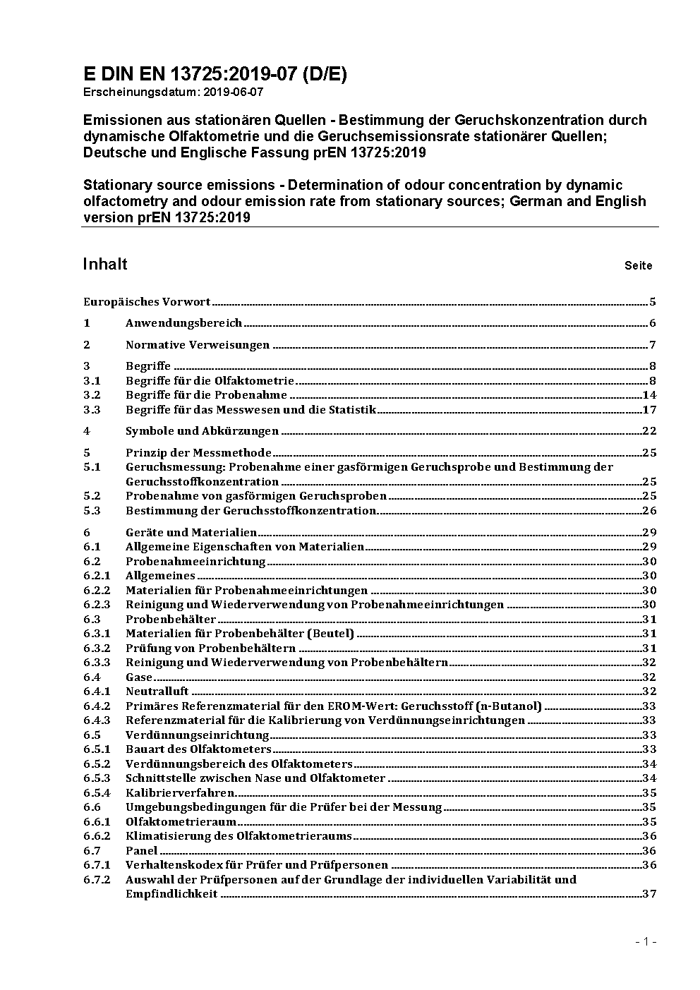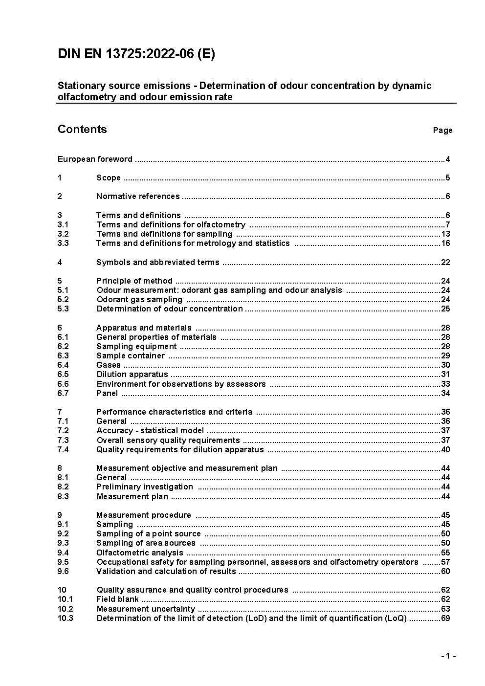 This European Standard (EN) describes an effect-related (olfactory) measurement method to quantify odour emissions with the aim of assessing a potential odour nuisance in the neighbourhood of an odour source. Sensor in this method is the human sense of smell the sensitivity of which is calibrated as one of the elements of the whole system as is required for quality assurance. Thus, defined performance characteristics can be observed.