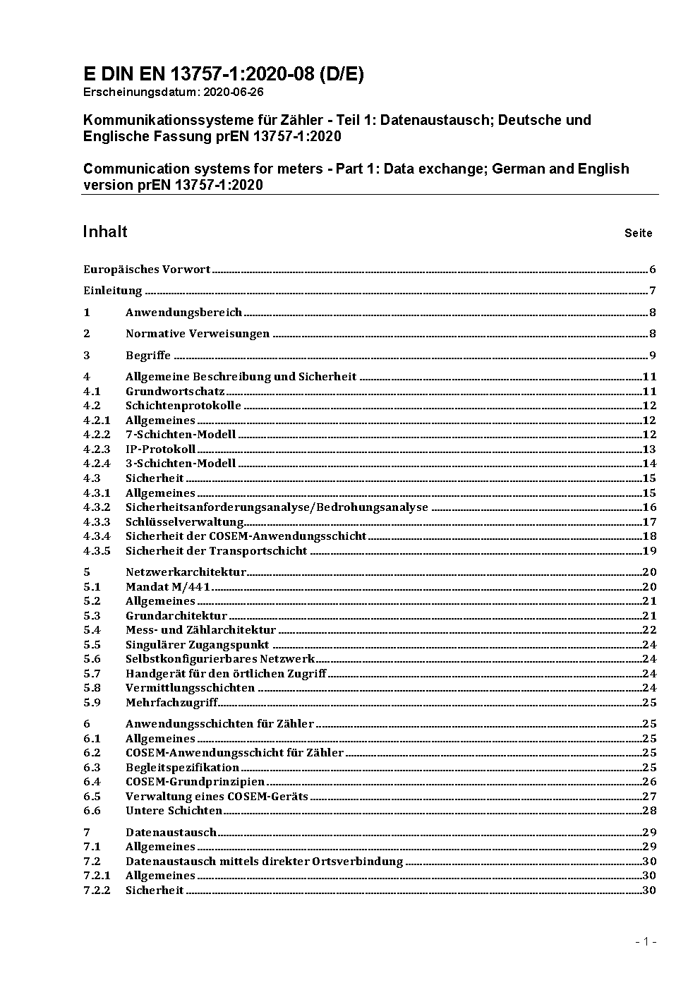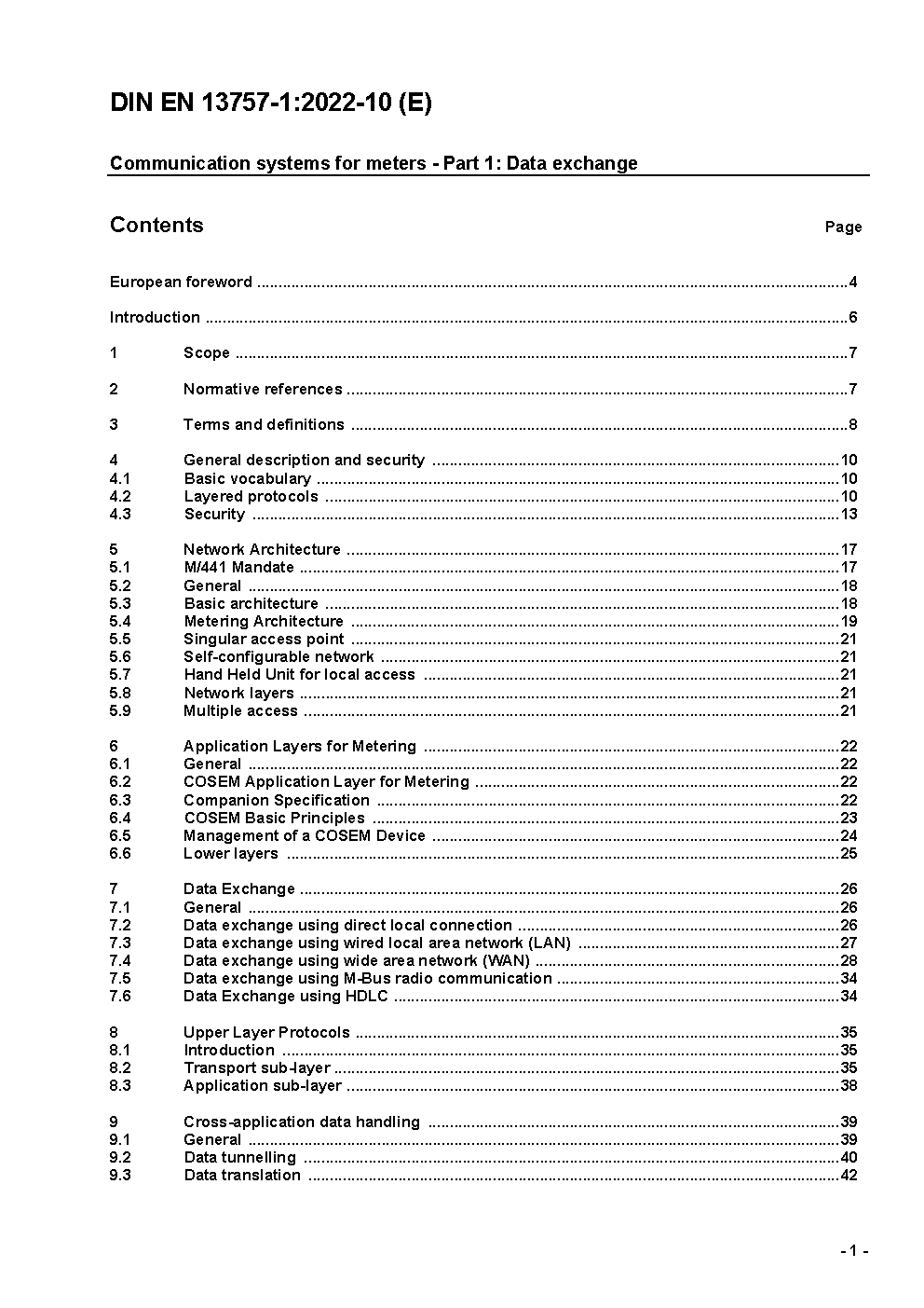 This document applies to the data exchange and communications for meters and remote reading of meters in a generic way. It is part 1 of the EN 13757 Standard. Additional parts of the EN13757 standards are:EN 13757 part 2: Physical and link layer, twisted pair baseband (M-Bus)EN 13757 part 3: Dedicated application layer (M-Bus)EN 13757 part 4: Wireless meter readout EN 13757 part 5: RelayingEN 13757 part 6: Local BusThe main use of this part 1 of EN13757 is to structure the combination and to specify corresponding elements and services for the communication with meters referring to existing European and International Standards. The basic communication requirements for meters are split into applications for data exchange via local meter interfaces (also for access to wide area networks (WAN)) and local area networks (LAN). With respect to the 3-layer model from IEC (derived from ISO-OSI 7 layer model) the appropriate interfaces and coherent services are defined - referring to existing European and International standards- for physical layer, data link layer and application layer for connection-oriented and connection-less data exchange as far as applicable to local area networks (LAN). In addition this European Standard applies to the application data object models and identification codes for the overall structure of the identification system and the mapping of all data items. This standard is intended for use, but not restricted to, meters with limitation in energy for operation and/or communication. The primary focus is to offer conclusive combinations of generic interfaces and services to fulfil market and technical requirements by open architecture, inter-operability and flexibility for innovation.This is ensured by a structure which allows to select appropriate (technology) based lower layers (physical and link layer) with connection method and to keep application layer and application functionality.
