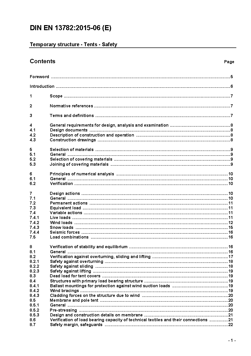 This European Standard specifies safety requirements which need to be observed at design, calculation, manufacture, installation, maintenance, operation, examination and testing of mobile, temporary installed tents more than 50 m2 ground area. For tents less than 50 m2 ground area, it is not necessary to produce the tent book (see Clause 14) and the producer will provide a documentation concerning the burning behaviour of the fabrics and the stability of the structure. Two tents can be considered as two tents if the distance between them is more than 5 m except otherwise agreed. These tents are intended to be installed and dismounted repeatedly without loss of substance, temporarily as well as on short term or long-term basis at any places, and multiple purposes. A simplified calculation for tents with a maximum space of 12 m and a maximum capacity of 300 people is allowed for traditional pole and rope tents. The field of application of this European Standard covers all kind of temporary covered structures. So the tents erected for a temporary period and dismantled for use elsewhere in fairgrounds and amusement parks are covered by this European Standard. The content of this European Standard collects the different existing national regulations and guidelines as far as possible.