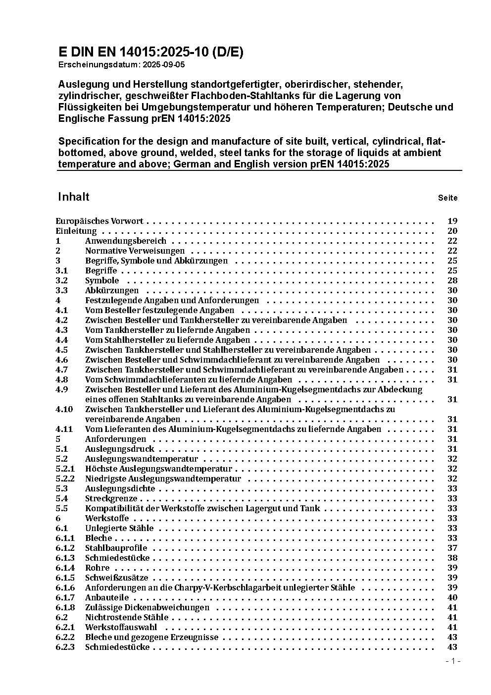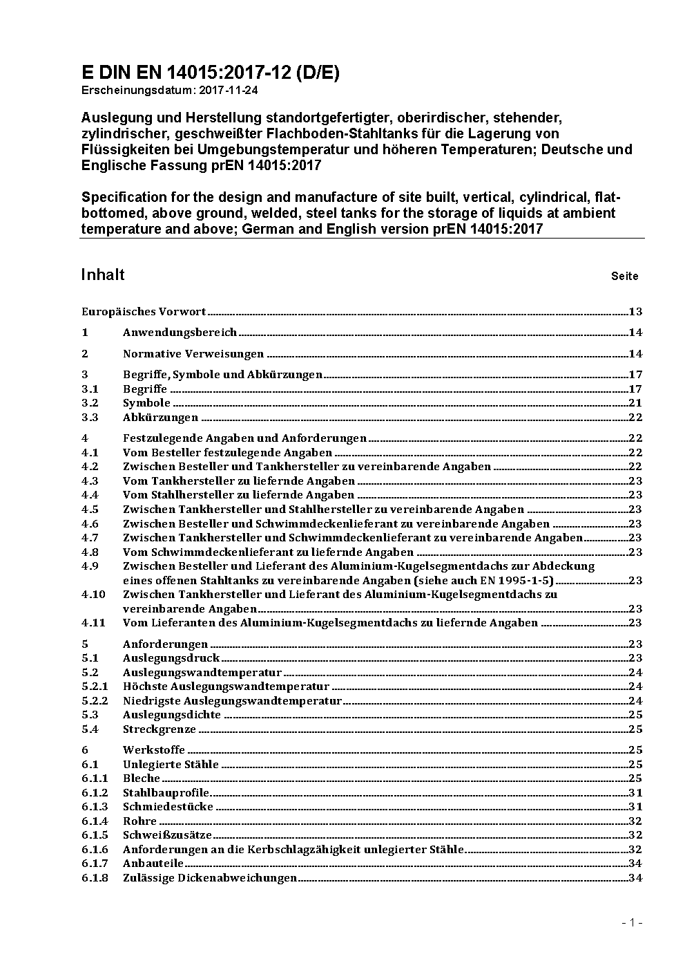 Specification for the design and manufacture of site built, vertical, cylindrical, flat-bottomed, above ground, welded, steel tanks for the storage of liquids at ambient temperature and above; German version EN 14015:2004
