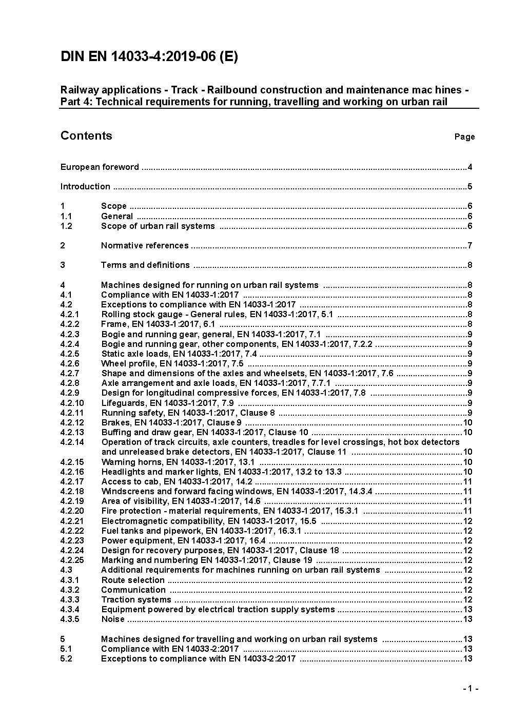 This European Standard deals with the technical requirements to minimize the specific railway hazards of machines and other vehicles used for construction, maintenance and inspection of track, structures, track formation and fixed electric traction equipment, which can arise during the commissioning, the operation and the maintenance of machines when carried out in accordance with the specification given by the manufacturer or his authorised representative when designed and intended for running, travelling and/or working on urban railways only.The requirements in this standard amend those in Parts 1, 2 and 3 of EN 14033 as required for the use of the machine on urban railways.This European Standard does not apply to the following:- the requirements for quality of the work or performance of the machine;- the specific requirements established by the machine operator for the use of machines, which will be the subject of negotiation between the manufacturer and the controller of an urban railway.This European Standard does not establish the additional requirements for the following:- operation subject to special rules, e. g. potentially explosive atmospheres;- hazards due to natural causes, e. g. earthquake, lightning, flooding;- working methods;- operation in severe working conditions requiring special measures, e. g. work in tunnels or in cuttings, extreme environmental conditions such as: freezing temperatures, high temperatures, corrosive environments, tropical environments, contaminating environments, strong magnetic fields;- hazards occurring when used to handle suspended loads which may swing freely.