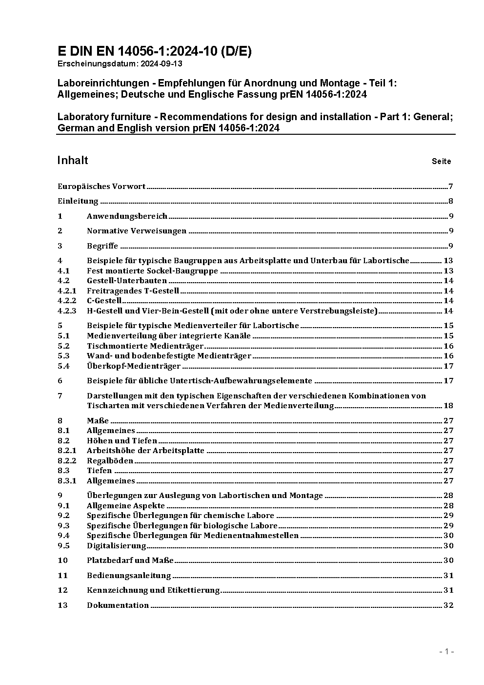 Laboreinrichtungen - Empfehlungen für Anordnung und Montage - Teil 1: Allgemeines; Deutsche und Englische Fassung prEN 14056-1:2024