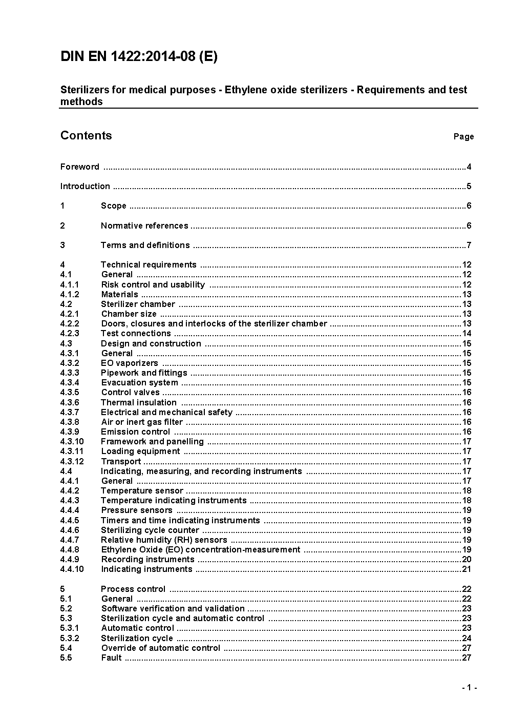 This European Standard specifies the requirements and the relevant tests for automatically controlled sterilizers employing ethylene oxide (EO) gas as the sterilant, either as a pure gas or a mixture with other gases, being used for the sterilization of medical devices and their accessories. These sterilizers are primarily used for the sterilization of heat labile medical devices. This European Standard specifies requirements for ethylene oxide sterilizers (EO-sterilizers) working at super or sub atmospheric pressure for: - the performance and design of sterilizers to ensure that the process is capable of sterilizing medical devices; - the equipment and controls of these sterilizers necessary for the validation and routine control of the sterilization processes. This standard applies when the sterilizer manufacturer declares compliance with EN 1422 as a means of conformity assessment to the essential requirements of the MDD (see annex ZA1) when intending to supply an EO sterilizer. The test loads described in this European Standard are selected to represent a number of loads for the evaluation of the performance of EO sterilizers for medical devices. However, specific loads may require the use of other test loads. This European standard does not specify those tests which are necessary to determine the probability of a processed product being sterile, nor the routine quality control tests required prior to release of sterile product. These topics are addressed in prEN ISO 11135. This European standard does not specify requirements for occupational safety associated with the design and operation of EO sterilization facilities. NOTE 1 For further information on safety, see examples in the Bibliography. National or regional regulations may also exist. This European Standard does not cover sterilizers which employ the injection of EO or mixtures containing EO directly into packages or into a flexible chamber. NOTE 2 See EN ISO 14937 General requirements for characterization of a sterilizing agent and the development, validation and routine control of a sterilization process for medical devices. Requirements on safety are addressed in EN 61010-1, EN 61010-2-040 and Directive 94/9/EC (ATEX) and are not repeated in this European standard. EN 60204-1 also provides guidance. This European standard is not intended as a checklist for suitability of an existing EO sterilizer when assessing compliance with prEN ISO 11135. This standard is not intended to be applied retrospectively. This European Standard does not cover analytical methods for determining levels of residual EO and/or its reaction products. NOTE 3 For further information see ISO 10993-7.