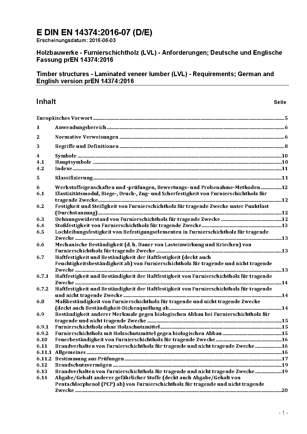 Timber structures - Laminated veneer lumber (LVL) - Requirements; German and English version prEN 14374:2016