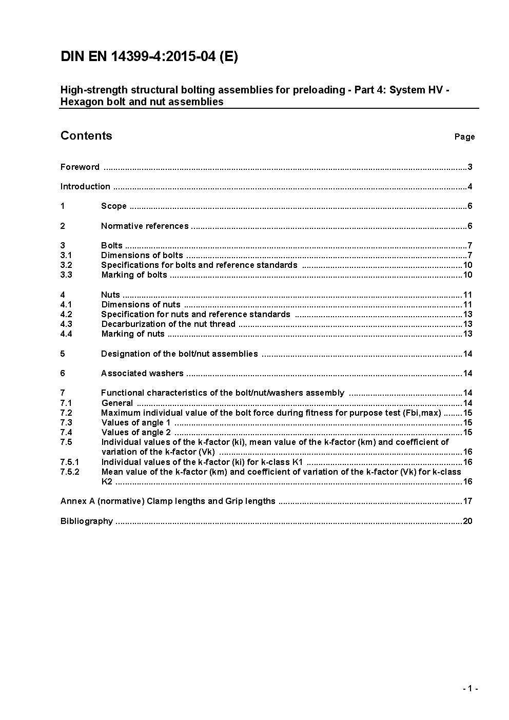 High-strength structural bolting assemblies for preloading - Part 4: System HV - Hexagon bolt and nut assemblies; German version EN 14399-4:2015