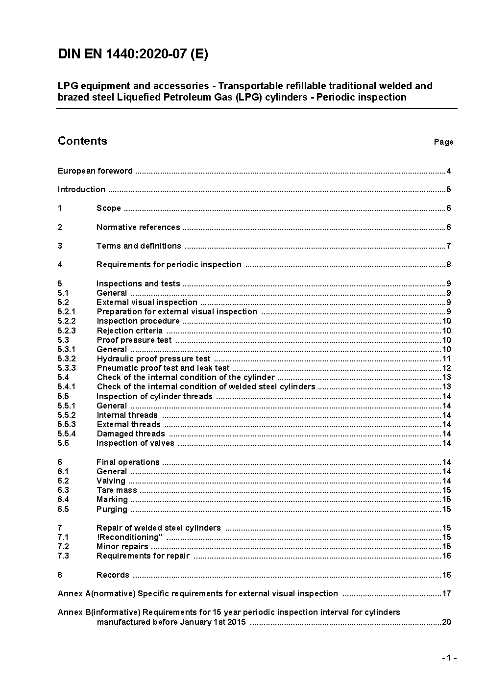 This European Standard specifies procedures for periodic inspection and testing, for transportable refillable LPG cylinders with a water capacity from 0,5 l up to and including 150 l. This European Standard is applicable to the following: - welded and brazed steel LPG cylinders with a specified minimum wall thickness (see EN 1442 and EN 12807 or the equivalent standard); - welded steel LPG cylinders manufactured to an alternative design and construction (see EN 14140:2003+A1 or the equivalent standard); - welded aluminium LPG cylinders (see EN 13110 or the equivalent standard); - composite LPG cylinders (see EN 14427 or the equivalent standard). This European Standard is intended to be applied to cylinders complying with RID/ADR (including pi marked cylinders) and also to existing non RID/ADR cylinder populations. This European Standard does not apply to cylinders permanently installed in vehicles.