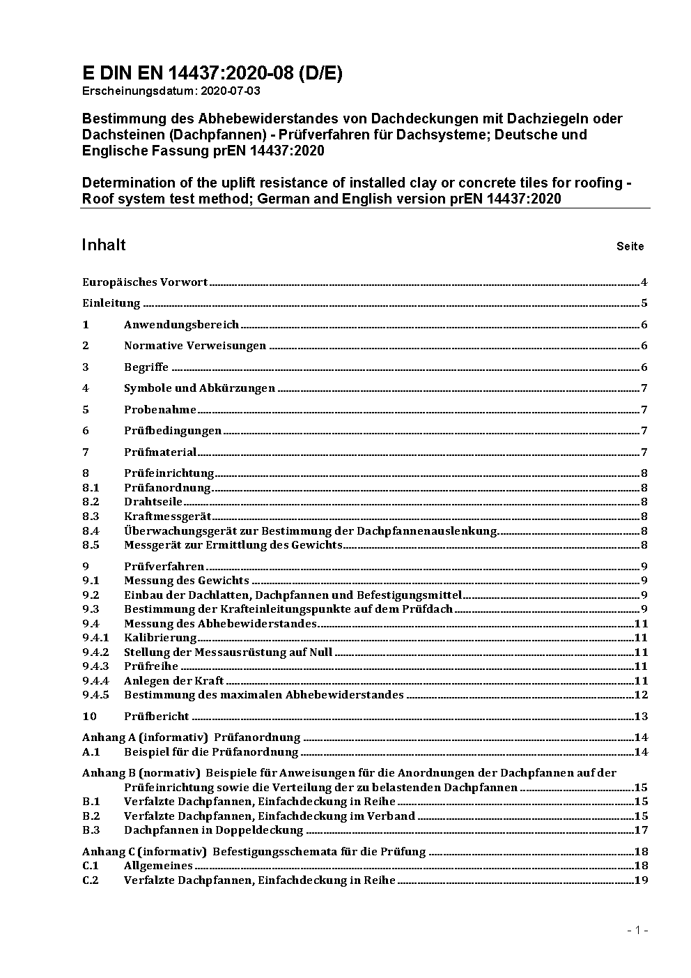 This European standard specifes a test method to establish the uplift resistance of installed clay or concrete tiles for roofing which are unfixed or mechanically fixed to the substructure.