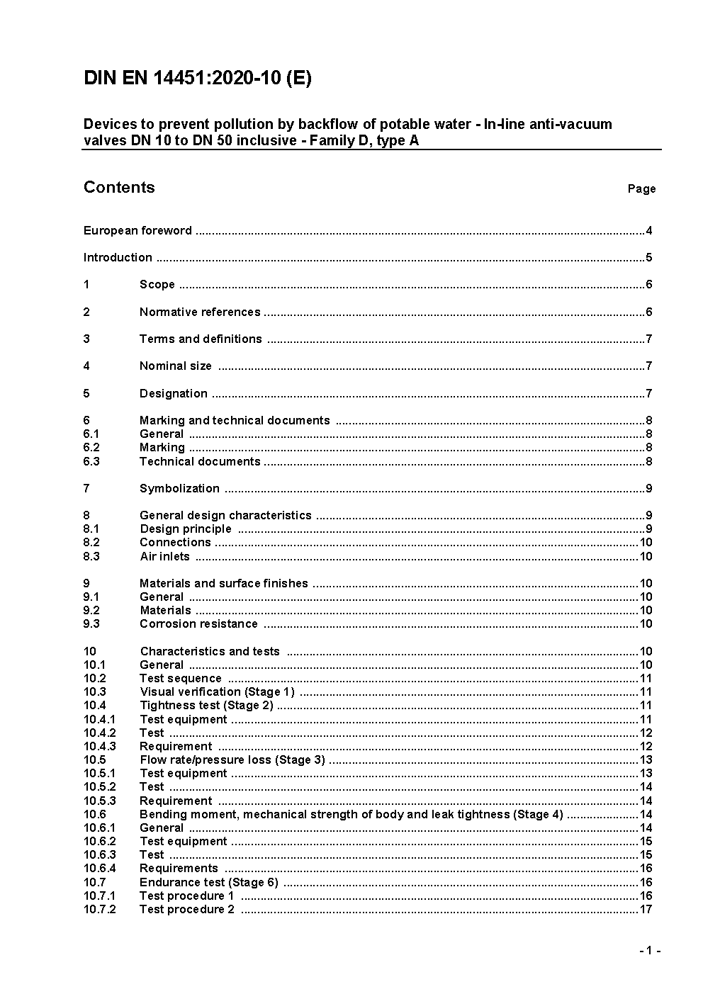 This European standard specifies the characteristics of one type of in-line anti-vacuum valves of nominal size DN 8 to DN 80 that are suitable for use in drinking water systems at pressures up to 1 MPa (10 bar) and temperatures up to 65 °C and for 1 h at 90 °C.