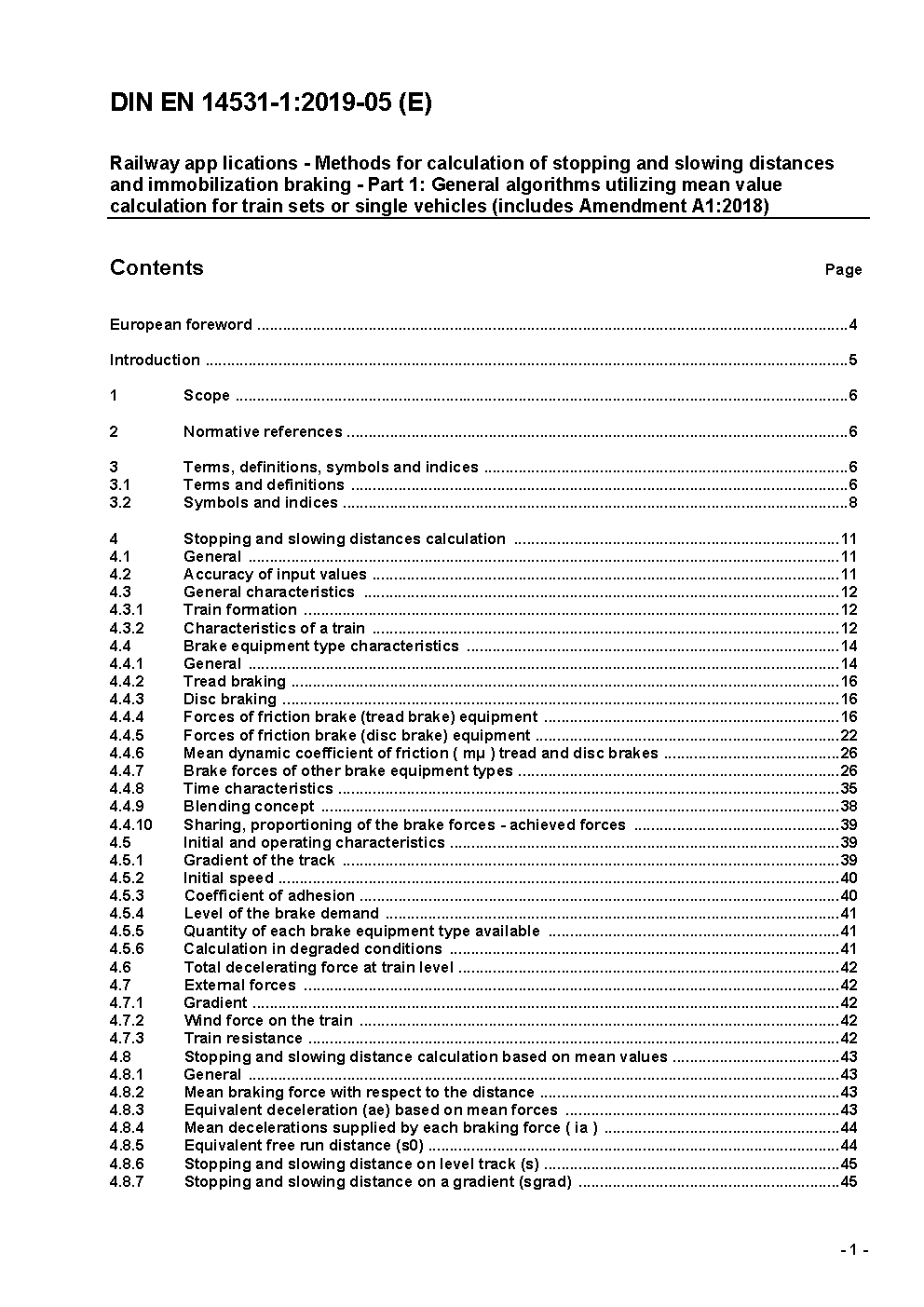 This European Standard describes general algorithms which may be used for all types of train sets, units or single vehicles, including high speed, locomotive and passenger coaches, conventional vehicles and wagons. This standard does not specify the performance requirements. It enables the estimation and,/or comparison by calculation of the various aspects of the performance: stopping or slowing distances, dissipated energy, power, force calculations and immobilization braking. If it is required to validate, verify or assess braking performance it is recommended that a more detailed calculation is performed in accordance with prEN 14531-2, i. e. a step by step calculation. This European Standard contains generic examples of the calculation of brake forces for individual brake equipment types and calculation of stopping distance and immobilisation braking relevant to a train (see Annex C and D).