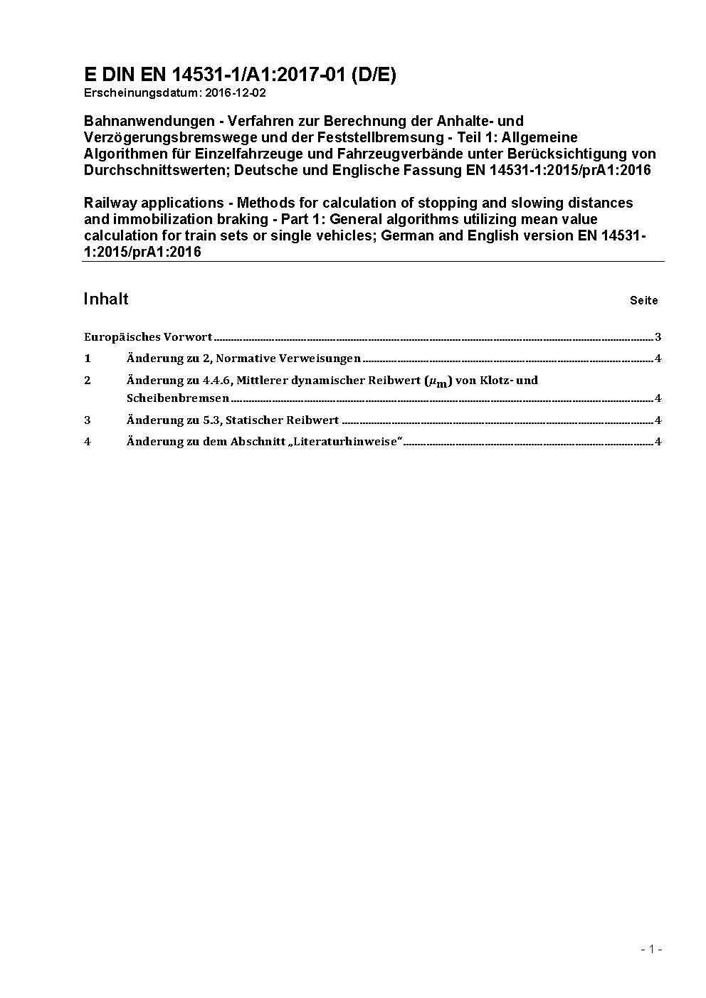 Railway applications - Methods for calculation of stopping and slowing distances and immobilisation braking - Part 1: General algorithms utilizing mean value calculation for train sets or single vehicles; German version prEN 14531-1:2012