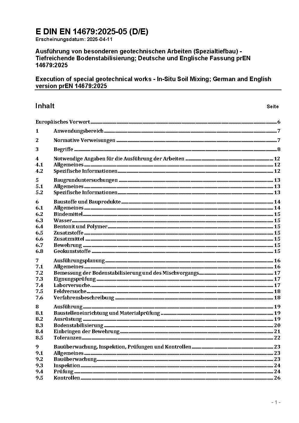 This European standard establishes the general principles for the execution of deep soil mixing (dry mixing and wet mixing). Requirements for the characteristics of materials used, mixing procedures, monitoring, testing and recording will be presented.