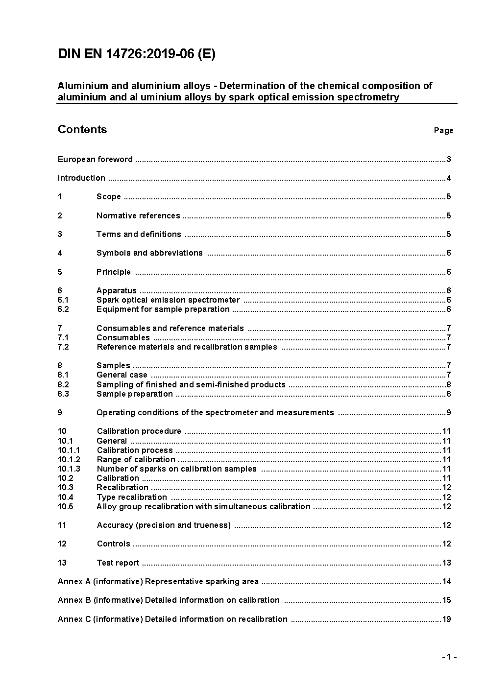 Aluminium and aluminium alloys - Determination of the chemical composition of aluminium and aluminium alloys by spark optical emission spectrometry; German version EN 14726:2019