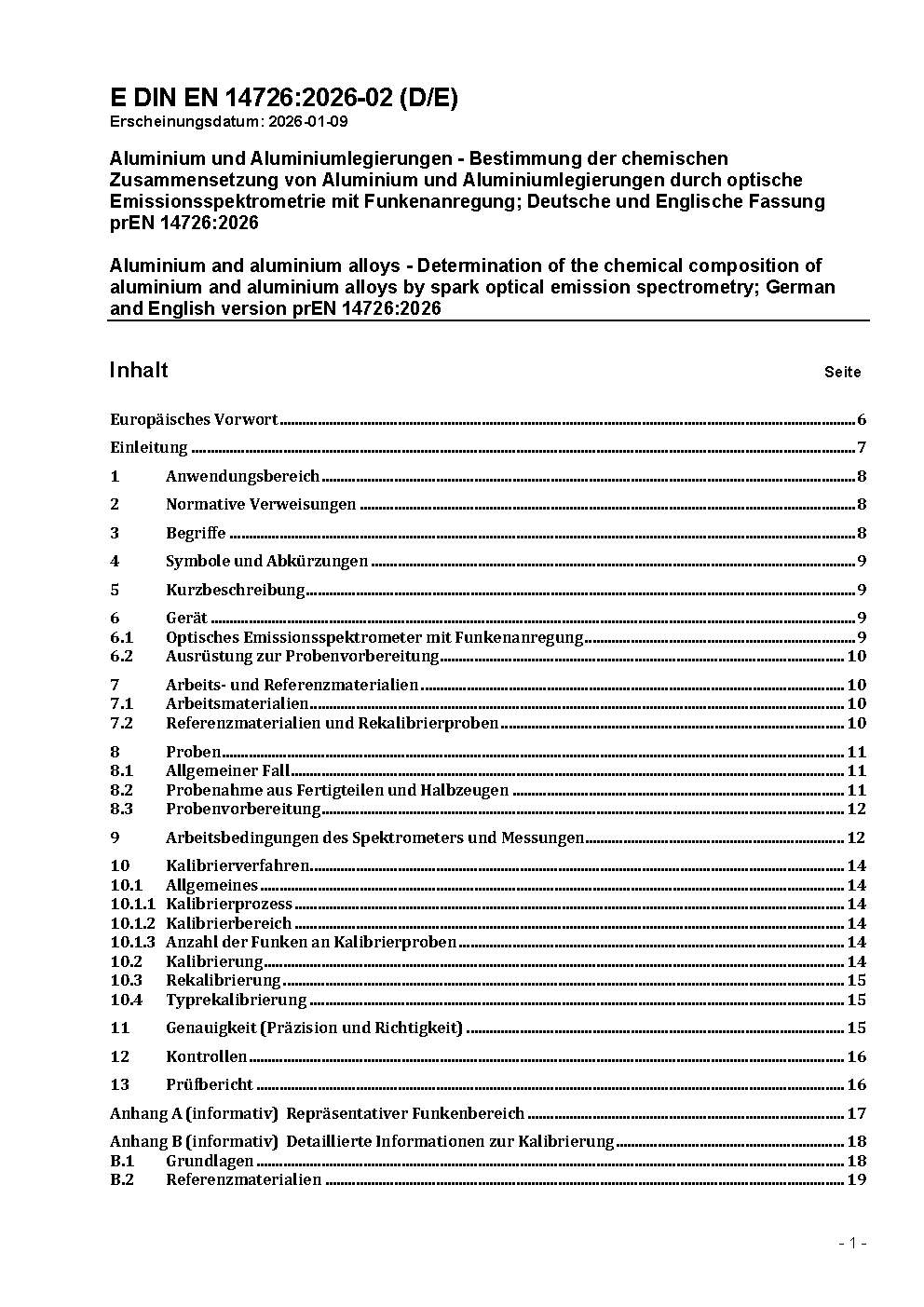 Aluminium und Aluminiumlegierungen - Bestimmung der chemischen Zusammensetzung von Aluminium und Aluminiumlegierungen durch optische Emissionsspektrometrie mit Funkenanregung; Deutsche Fassung EN 14726:2019