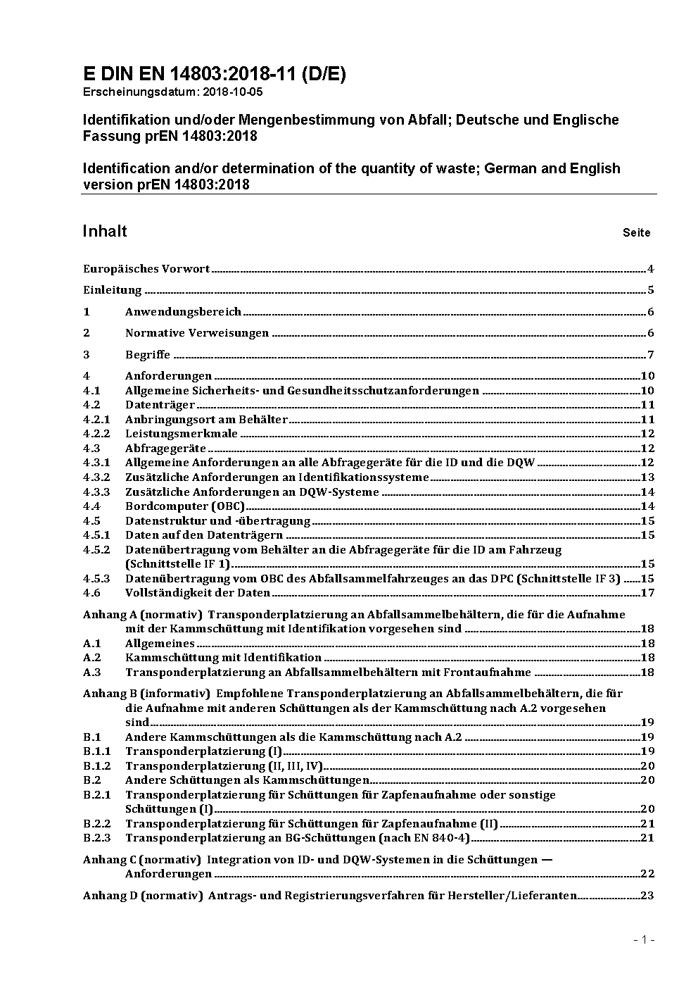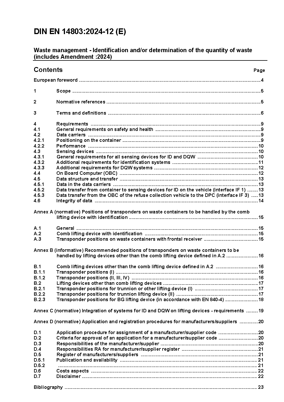 This standard specifies general requirements and verifications for methods of identification of waste containers and/or determination of the quantity of waste.