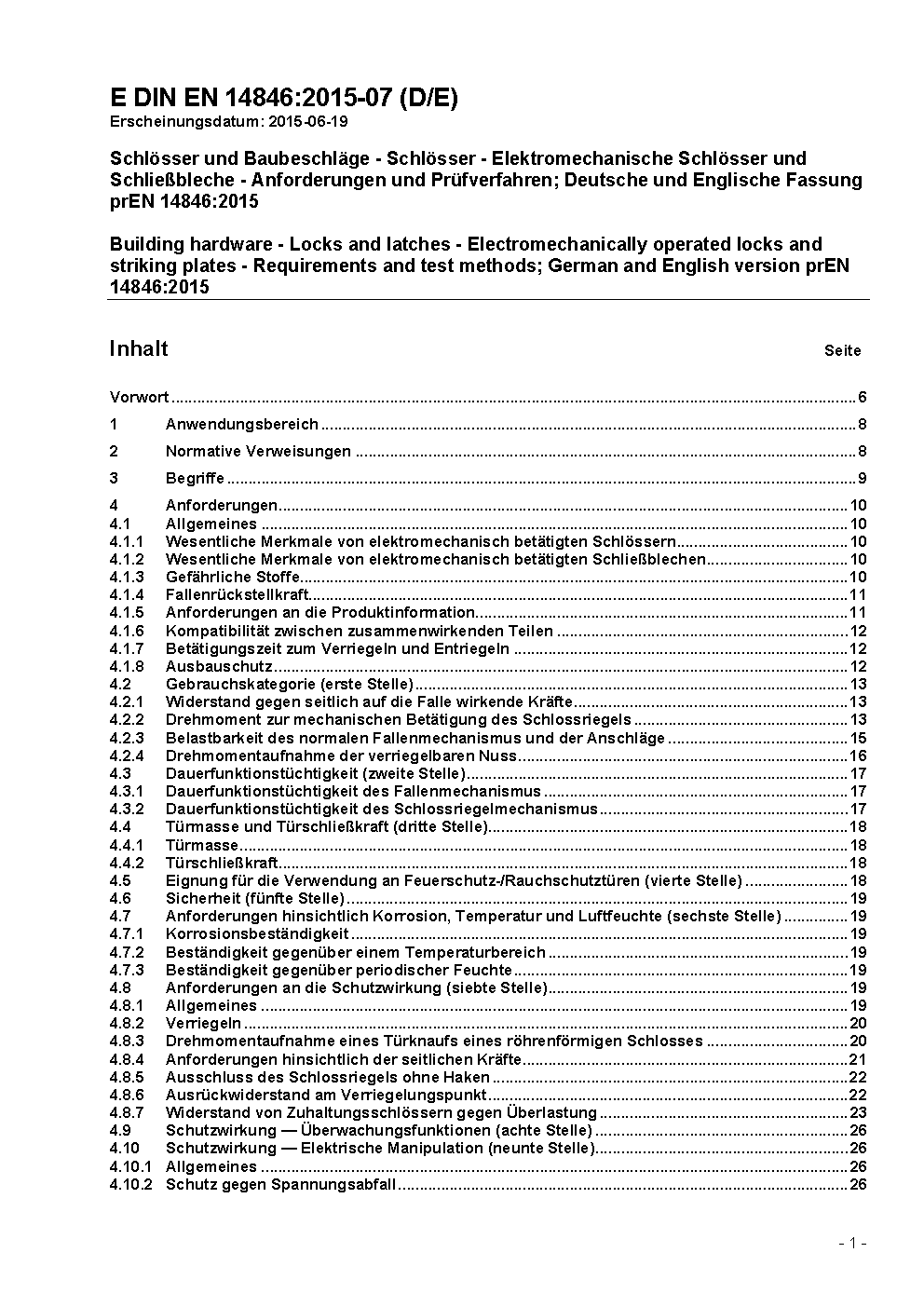 Building hardware - Locks and latches - Electromechanically operated locks and striking plates - Requirements and test methods; German version EN 14846:2008
