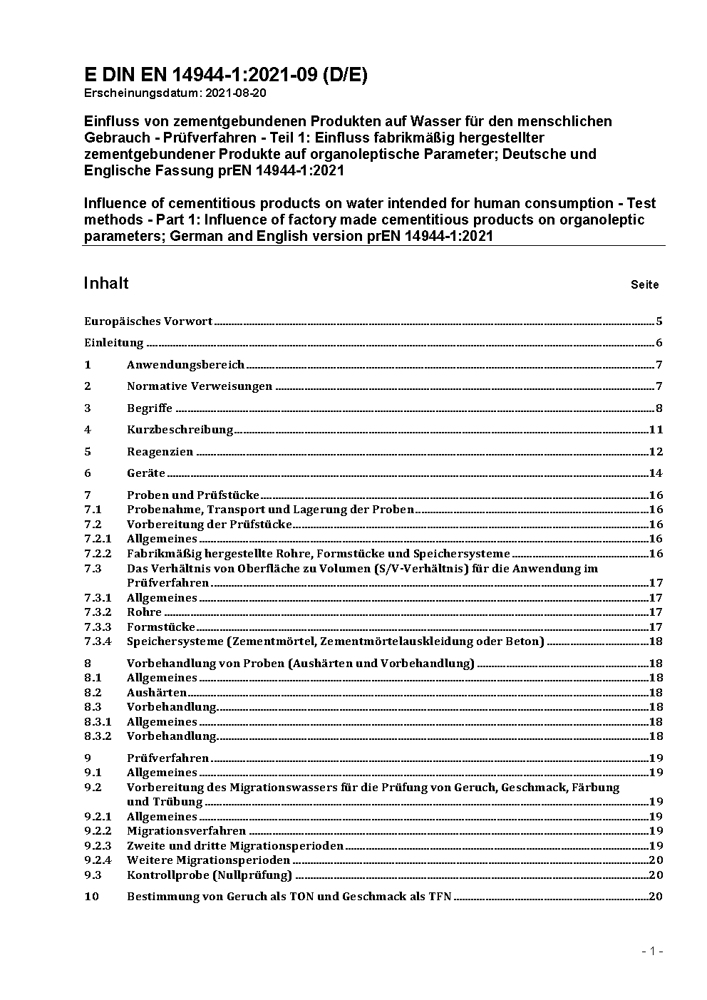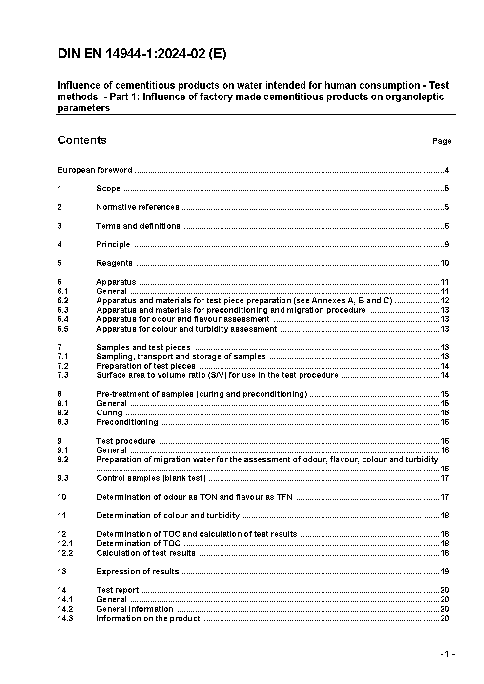 Influence of cementitious products on water intended for human consumption - Test methods - Part 1: Influence on organoleptic parameters and migration of organic substances (TOC) from factory made cementitious products; German and English version prEN 14944-1:2015