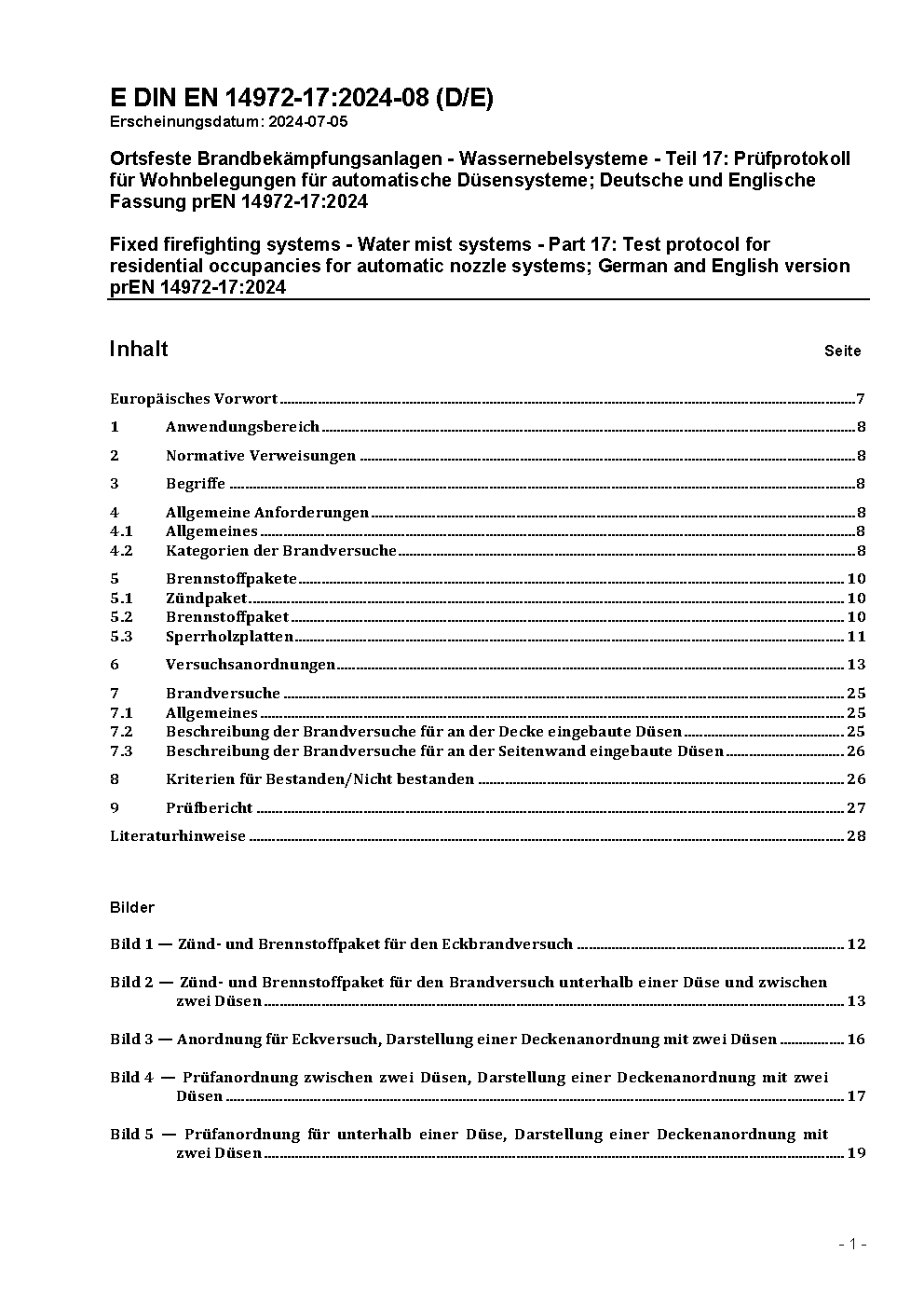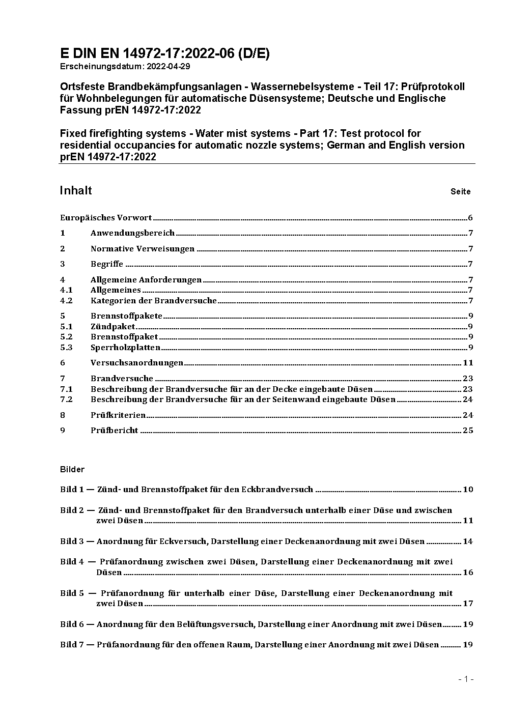 Ortsfeste Brandbekämpfungsanlagen - Wassernebelsysteme - Teil 17: Prüfprotokoll für Wohnbelegungen für automatische Düsensysteme; Deutsche und Englische Fassung prEN 14972-17:2022