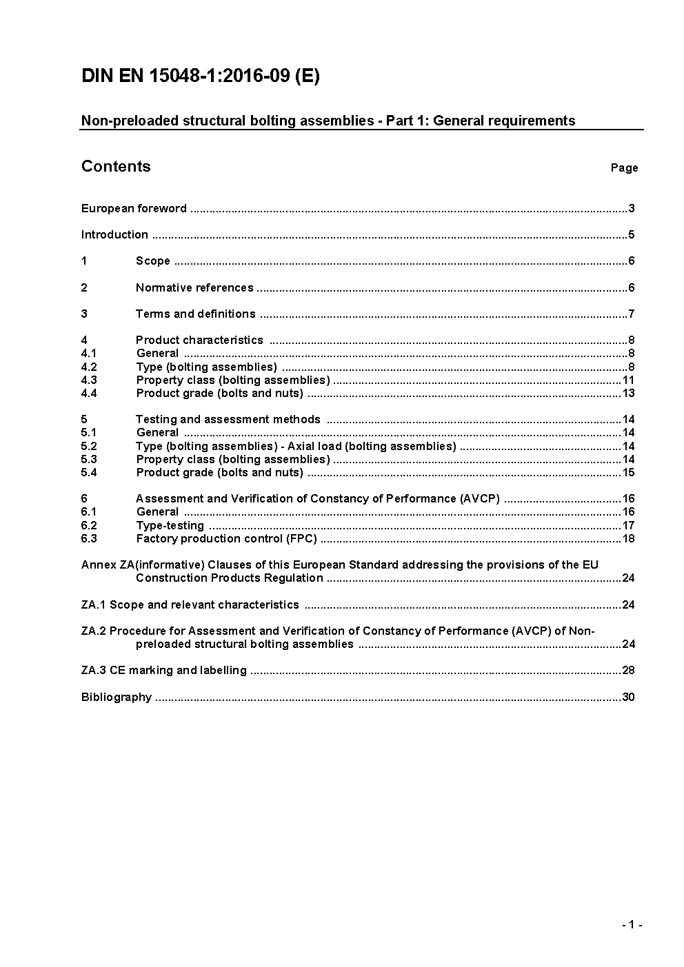 This part of this European standard specifies the general requirements for the components of bolt/nut/washer assemblies for non-preloaded structural bolting and for the assemblies themselves. It applies to bolts and nuts made of carbon steel, alloy steel and stainless steel with thread sizes from M12 to M36 and to the associated washers. Bolted connections with components assording to this European standard are able to be shear and/or tensile loaded.