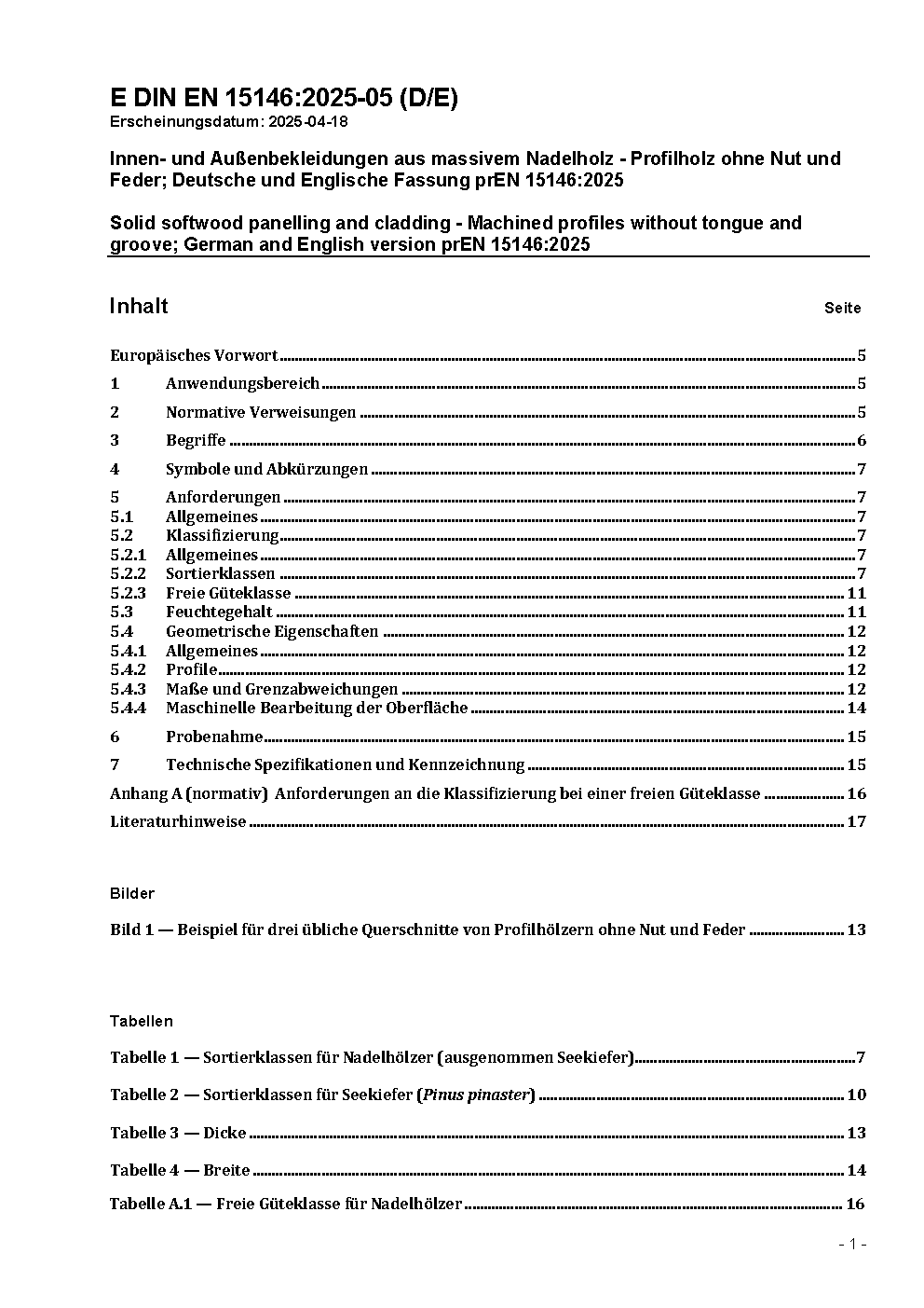 Innen- und Außenbekleidungen aus massivem Nadelholz - Profilholz ohne Nut und Feder; Deutsche und Englische Fassung prEN 15146:2025