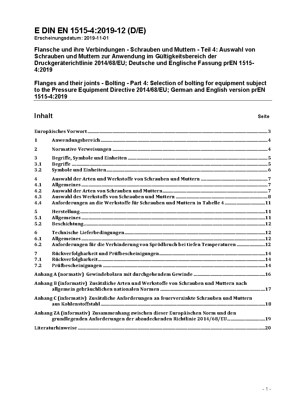 Flanges and their joints - Bolting - Part 4: Selection of bolting for equipment subject to the Pressure Equipment Directive 97/23/EC; German version EN 1515-4:2009