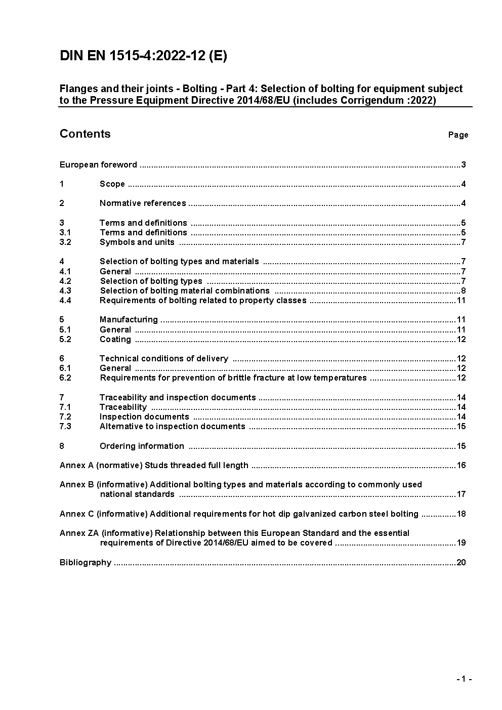 This European Standard is applicable to the selection of bolting for equipment subject to the Pressure Equip-ment Directive 97/23/EC. It specifies standards and additional requirements for dimensions, materials and technical conditions of delivery for bolting. The bolting of this standard is selected for the combined use with flanges according to the series EN 1092 (PN designated flanges) and the series EN 1759 (Class designated flanges), but not for general purpose.