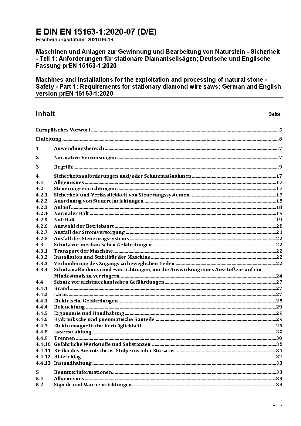 Maschinen und Anlagen zur Gewinnung und Bearbeitung von Naturstein - Sicherheit - Teil 1: Anforderungen für stationäre Diamantseilsägen; Deutsche und Englische Fassung prEN 15163-1:2020