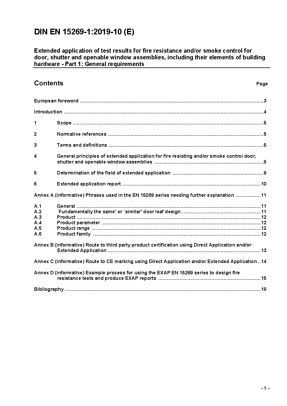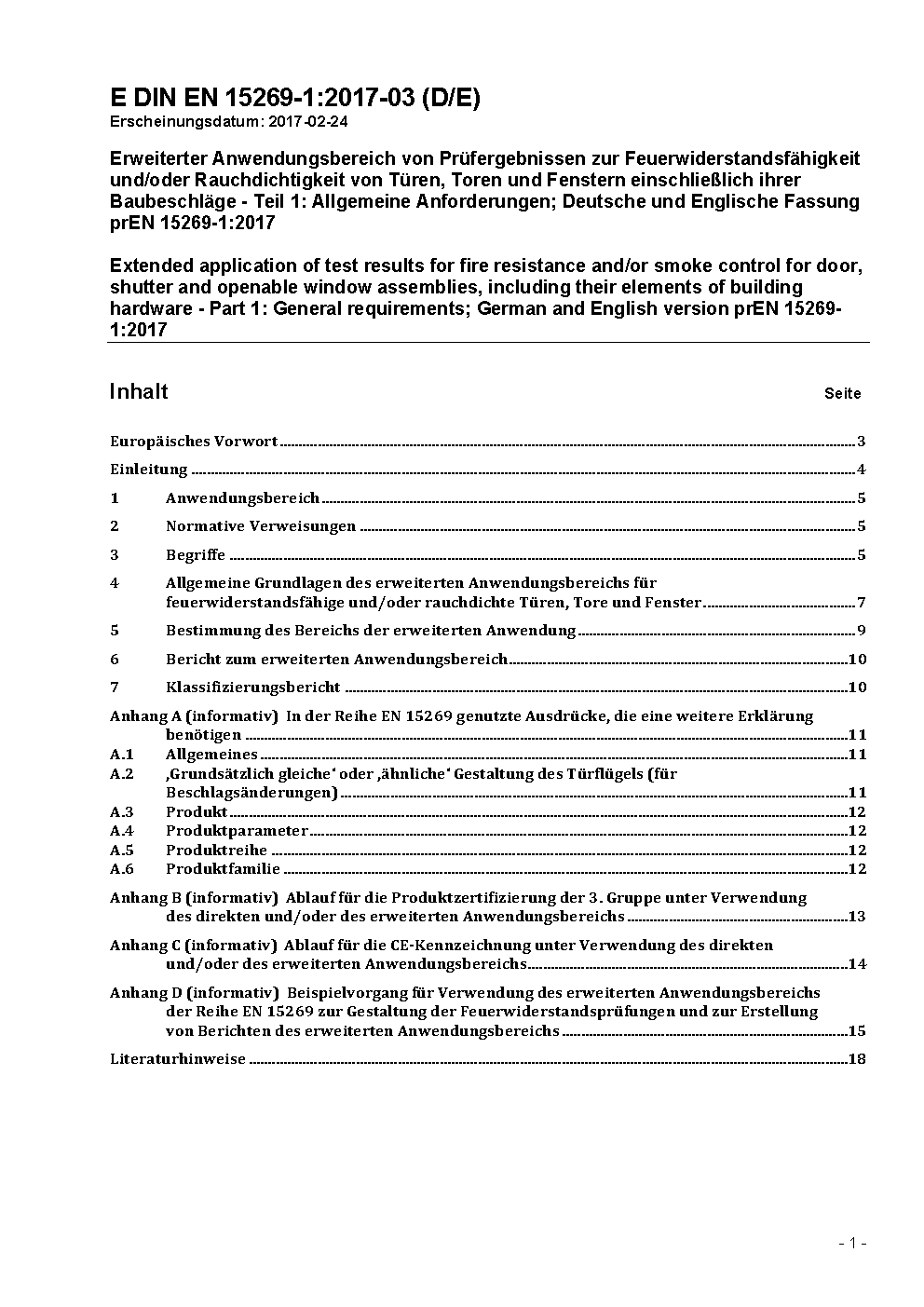 Extended application of test results for fire resistance and/or smoke control for door, shutter and openable window assemblies, including their elements of building hardware - Part 1: General requirements; German and English version prEN 15269-1:2017