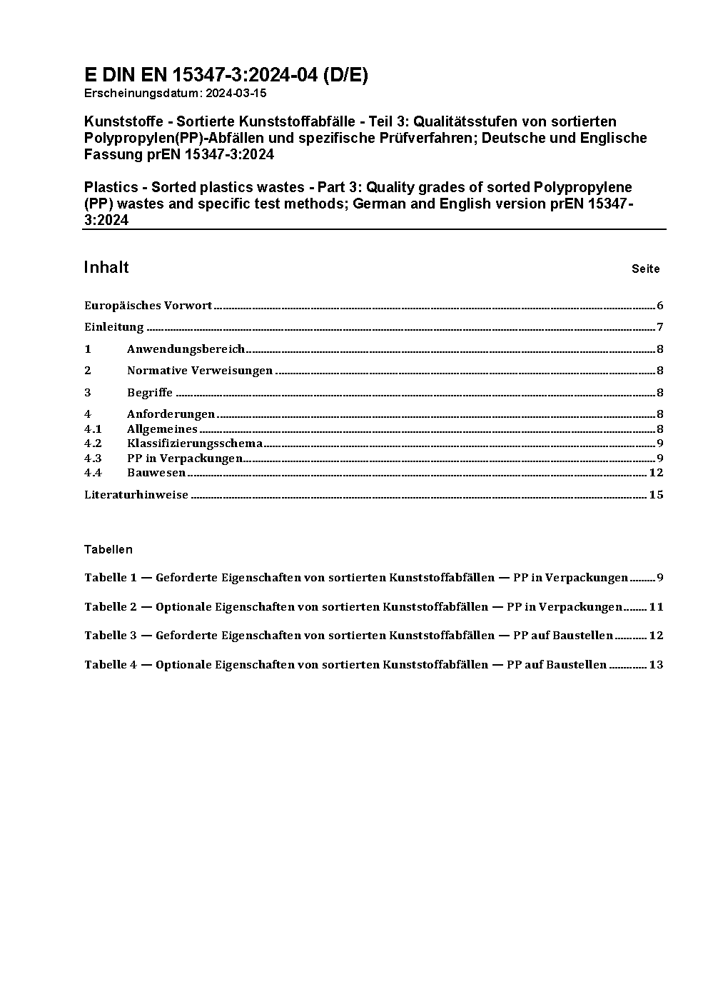 Kunststoffe - Sortierte Kunststoffabfälle - Teil 3: Qualitätsstufen von sortierten Polypropylen(PP)-Abfällen und spezifische Prüfverfahren; Deutsche Fassung EN 15347-3:2025