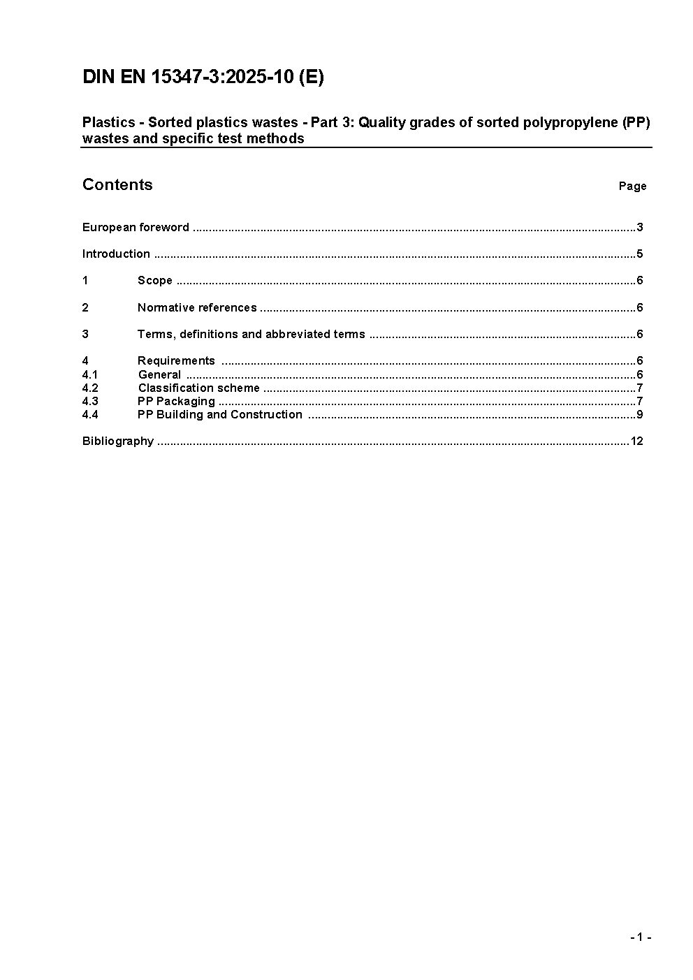 Plastics - Sorted plastics wastes - Part 3: Quality grades of sorted polypropylene (PP) wastes and specific test methods; German version EN 15347-3:2025