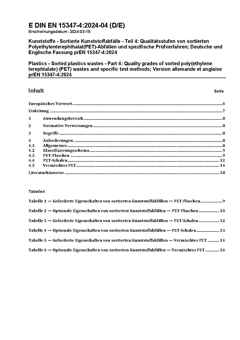 Plastics - Sorted plastics wastes - Part 4: Quality grades of sorted poly(ethylene terephtalate) (PET) wastes and specific test methods; German and English version prEN 15347-4:2024