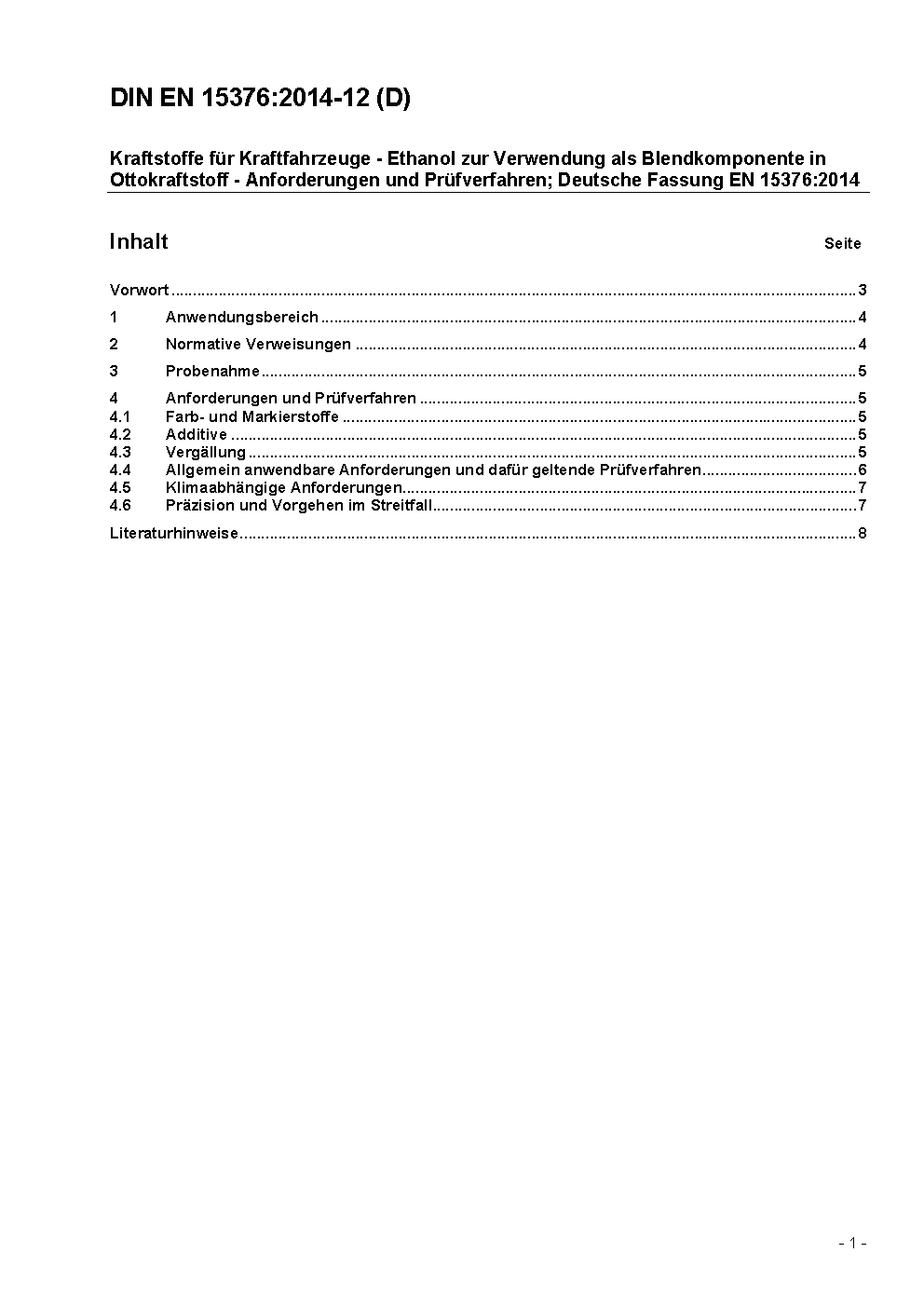 Automotive fuels - Ethanol as a blending component for petrol - Requirements and test methods; German version prEN 15376:2013