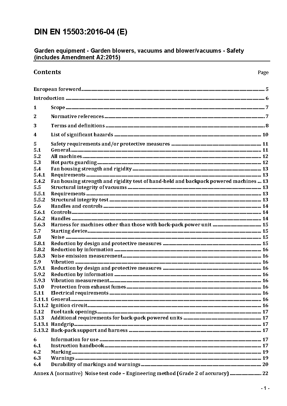 This European Standard specifies the safety requirements and their verification for the design and construction of hand-held combustion engine powered and back-pack combustion engine powered, garden vacuums and garden blower/vacuums with or without shredding means and garden blowers, designed for one operator only. In addition, it specifies the type of information on safe working practices (including residual risks) to be provided by the manufacturer. This amendment concerns a modification in 5.6.1.4 as well as updating of references and deletion of annex ZA.