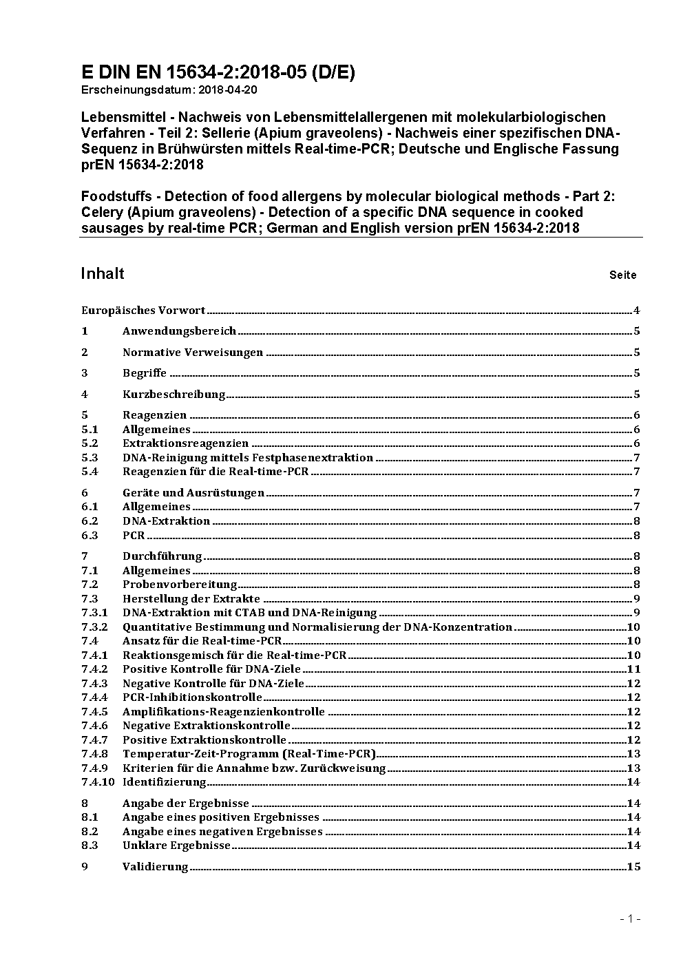 Foodstuffs - Detection of food allergens by molecular biological methods - Part 2: Celery (Apium graveolens) - Detection of a specific DNA sequence in cooked sausages by real-time PCR; German and English version prEN 15634-2:2018