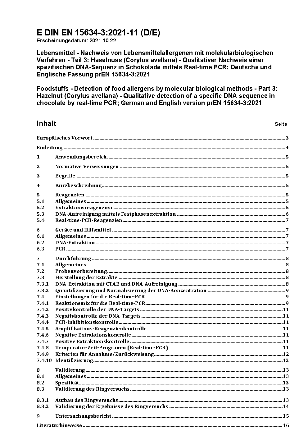 Lebensmittel - Nachweis von Lebensmittelallergenen mit molekularbiologischen Verfahren - Teil 3: Haselnuss (Corylus avellana) - Qualitativer Nachweis einer spezifischen DNA-Sequenz in Schokolade mittels Real-time PCR; Deutsche Fassung EN 15634-3:2023