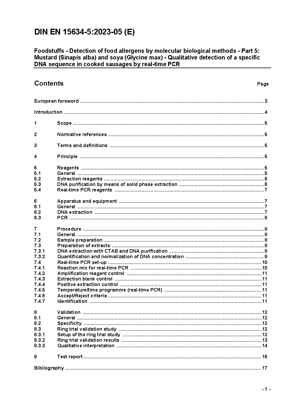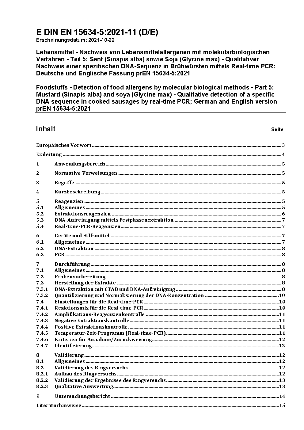 Lebensmittel - Nachweis von Lebensmittelallergenen mit molekularbiologischen Verfahren - Teil 5: Senf (Sinapis alba) sowie Soja (Glycine max) - Qualitativer Nachweis einer spezifischen DNA-Sequenz in Brühwürsten mittels Real-time PCR; Deutsche Fassung EN 15634-5:2023