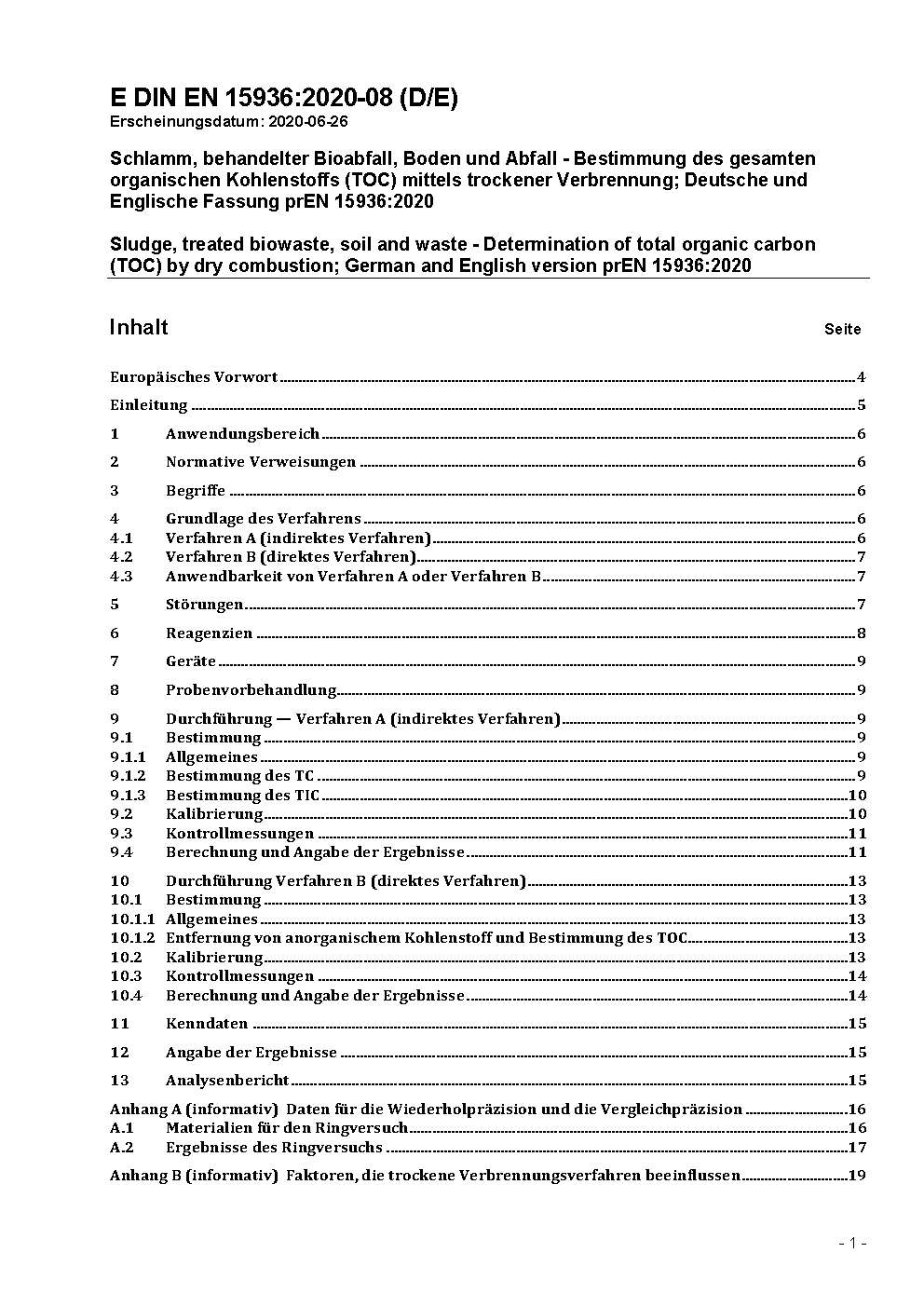 Sludge, treated biowaste, soil and waste - Determination of total organic carbon (TOC) by dry combustion; German version EN 15936:2012