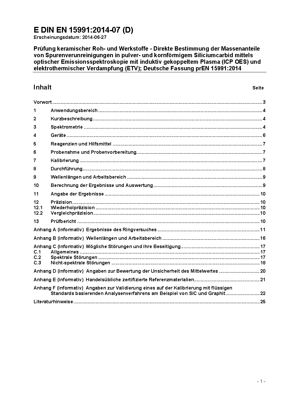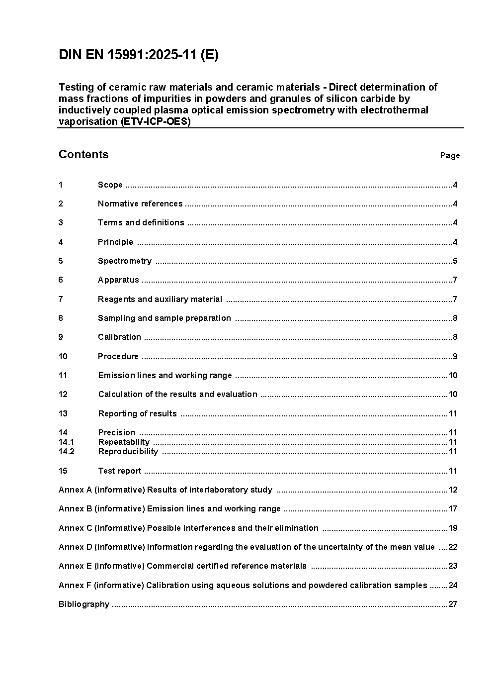 Prüfung keramischer Roh- und Werkstoffe - Direkte Bestimmung der Massenanteile von Spurenverunreinigungen in pulver- und kornförmigem Siliciumcarbid mittels optischer Emissionsspektroskopie mit induktiv gekoppeltem Plasma und elektrothermischer Verdampfung (ETV-ICP-OES); Deutsche und Englische Fassung prEN 15991:2024
