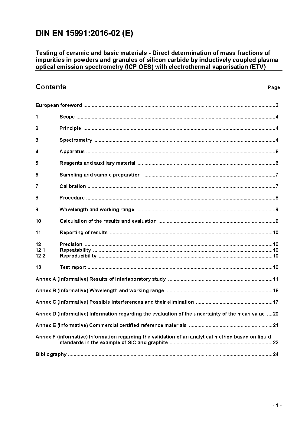 Testing of ceramic raw materials and ceramic materials - Direct determination of mass fractions of impurities in powders and granules of silicon carbide by inductively coupled plasma optical emission spectrometry with electrothermal vaporisation (ETV-ICP-OES); German and English version prEN 15991:2024