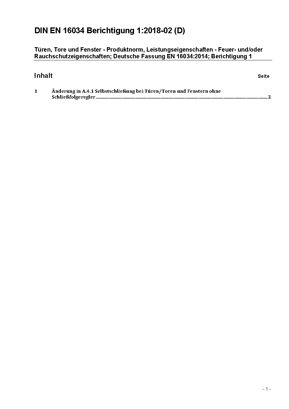 Pedestrian doorsets, industrial, commercial, garage doors and openable windows - Product standard, performance characteristics - Fire resistance and/or smoke control characteristics; German version EN 16034:2014; Corrigendum 1