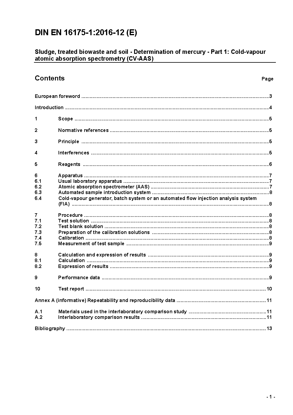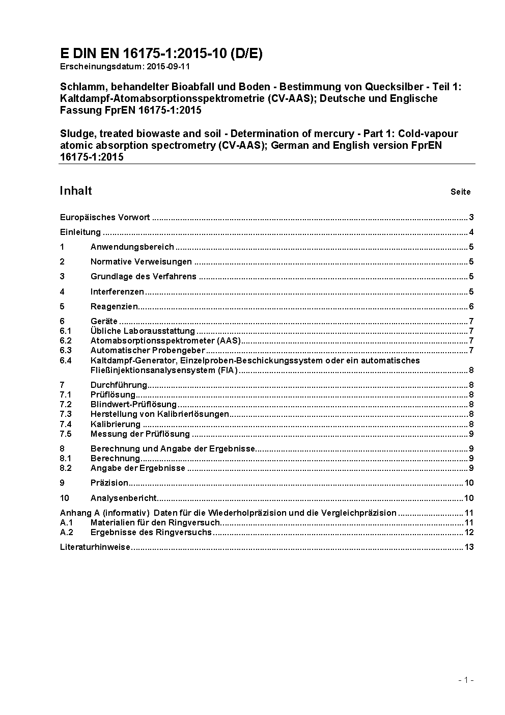 Sludge, treated biowaste and soil - Determination of mercury - Part 1: Cold-vapour atomic absorption spectrometry (CV-AAS); German and English version FprEN 16175-1:2015
