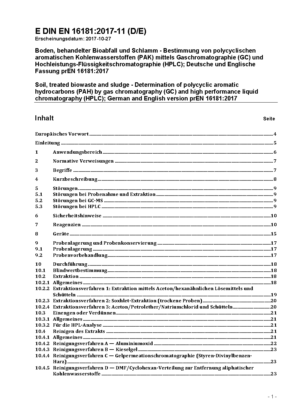 Soil, treated biowaste and sludge - Determination of polycyclic aromatic hydrocarbons (PAH) by gas chromatography (GC) and high performance liquid chromatography (HPLC); German and English version prEN 16181:2017