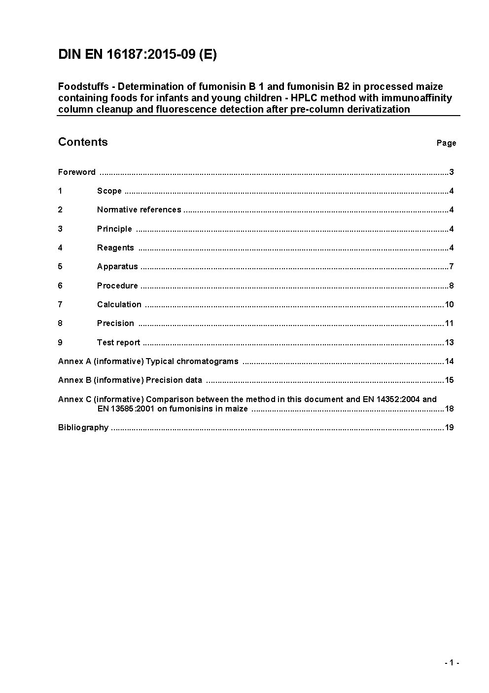 Foodstuffs - Determination of fumonisin B1 and fumonisin B2 in processed maize containing foods for infants and young children - HPLC method with immunoaffinity column cleanup and fluorescence detection after pre-column derivatization; German version EN 16187:2015