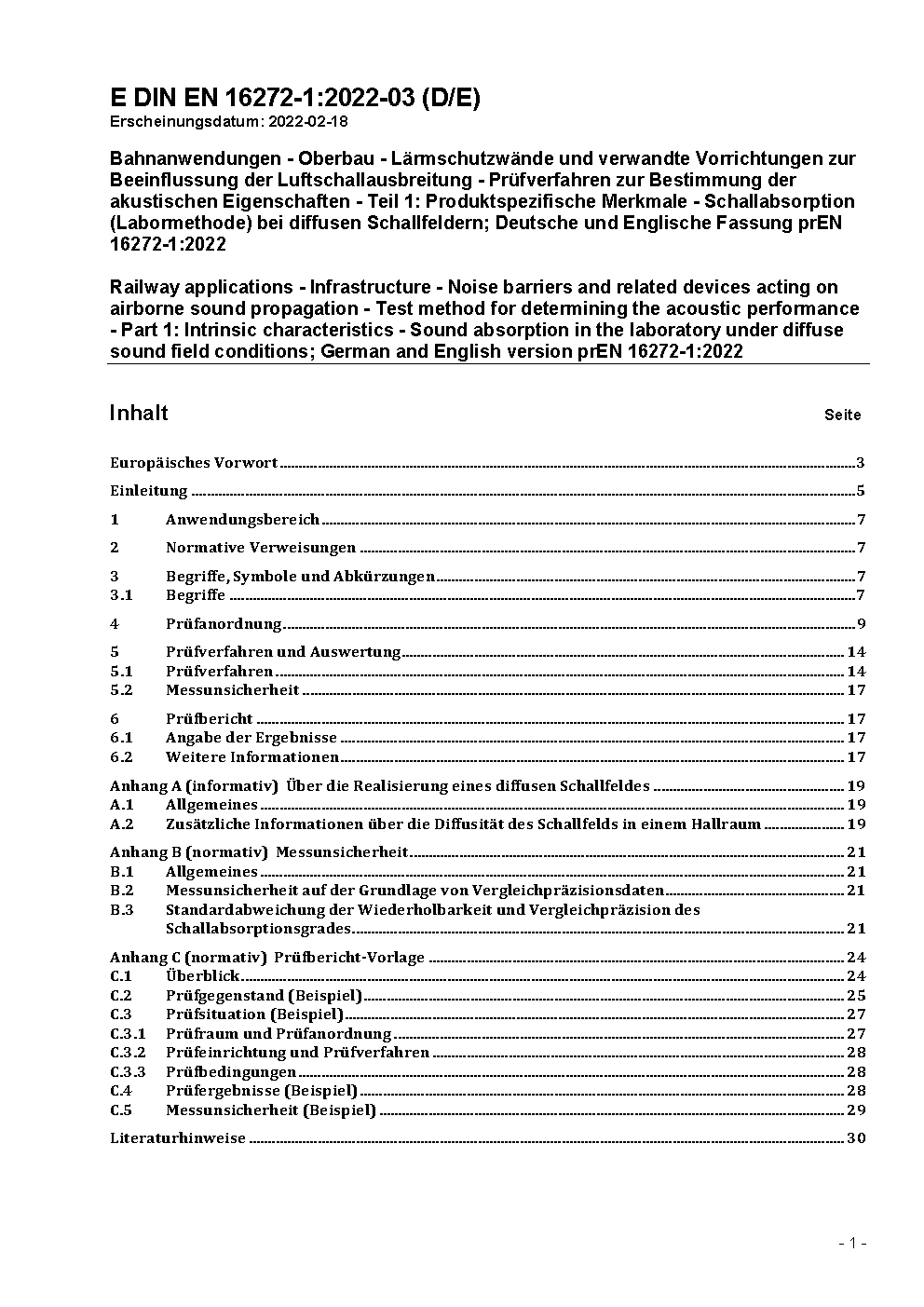 Railway applications - Track - Noise barriers and related devices acting on airborne sound propagation - Test method for determining the acoustic performance - Part 1: Intrinsic characteristics - Sound absorption in the laboratory under diffuse sound field conditions; German version EN 16272-1:2012