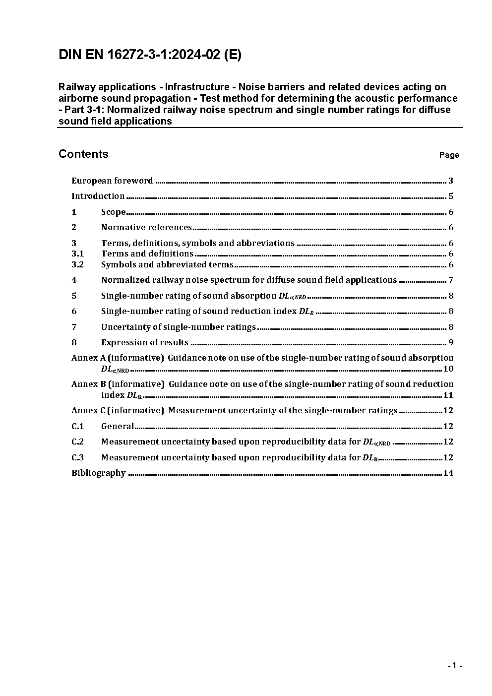 Railway applications - Track - Noise barriers and related devices acting on airborne sound propagation - Test method for determining the acoustic performance - Part 3-1: Normalized railway noise spectrum and single number ratings for diffuse field applications; German version EN 16272-3-1:2012