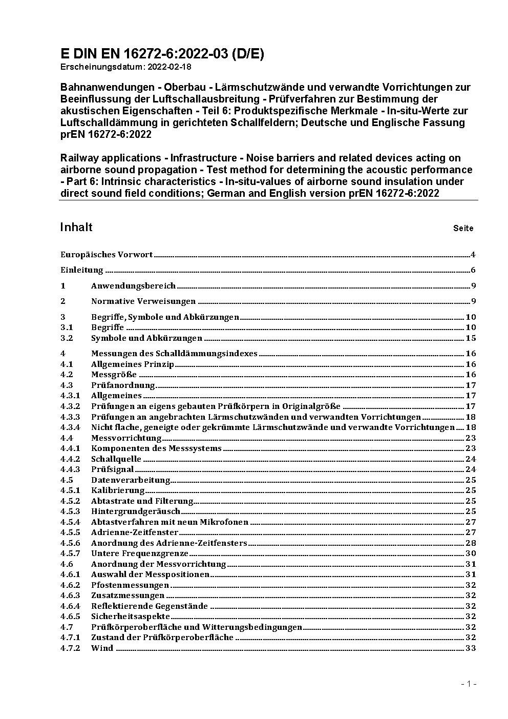 Railway applications - Track - Noise barriers and related devices acting on airborne sound propagation - Test method for determining the acoustic performance - Part 6: Intrinsic characteristics - In situ values of airborne sound insulation under direct sound field conditions; German version prEN 16272-6:2012