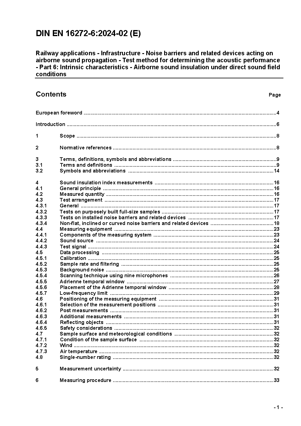 This document specifies a test method for measuring a quantity representative of the intrinsic characteristics of airborne sound insulation for railway noise barriers, i.e. the sound insulation index. All noise reducing devices different from noise barriers and related devices acting on airborne sound propagation, e. g. devices for attenuation of ground borne vibration and on board devices are out of the scope of this document.