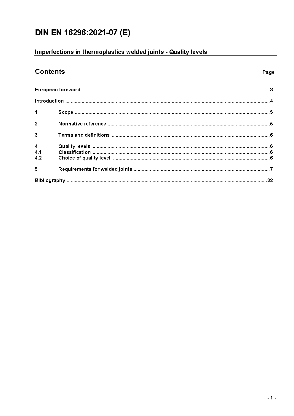 This European Standard provides quality levels for imperfections in thermoplastics welded joints. It applies to material thickness above 2.0 mm. Three quality levels are given in order to permit application for a wide range of welded fabrication. They are designated by symbols B, C and D, where B is the most stringent. The quality levels refer to production quality and not to the fitness-for-purpose (see 3.2) of the product manufactured