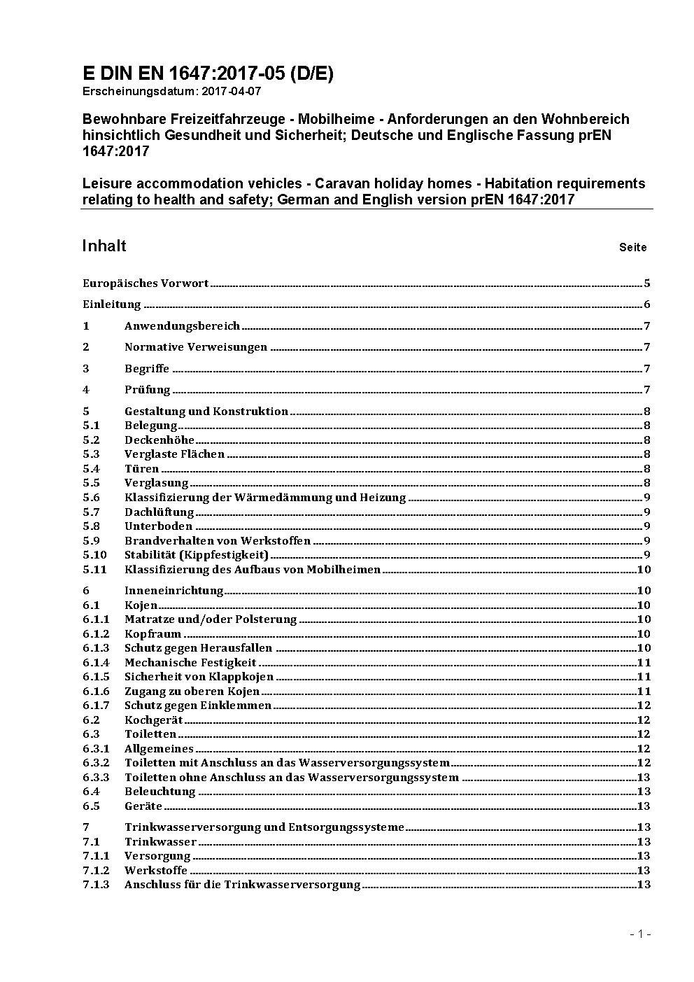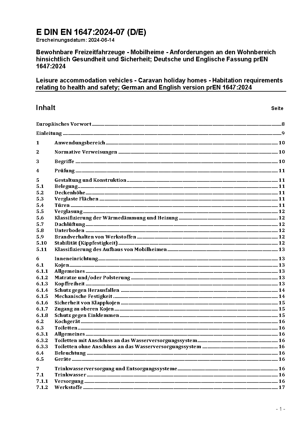 Leisure accommodation vehicles - Caravan holiday homes - Habitation requirements relating to health and safety; German version prEN 1647:2011
