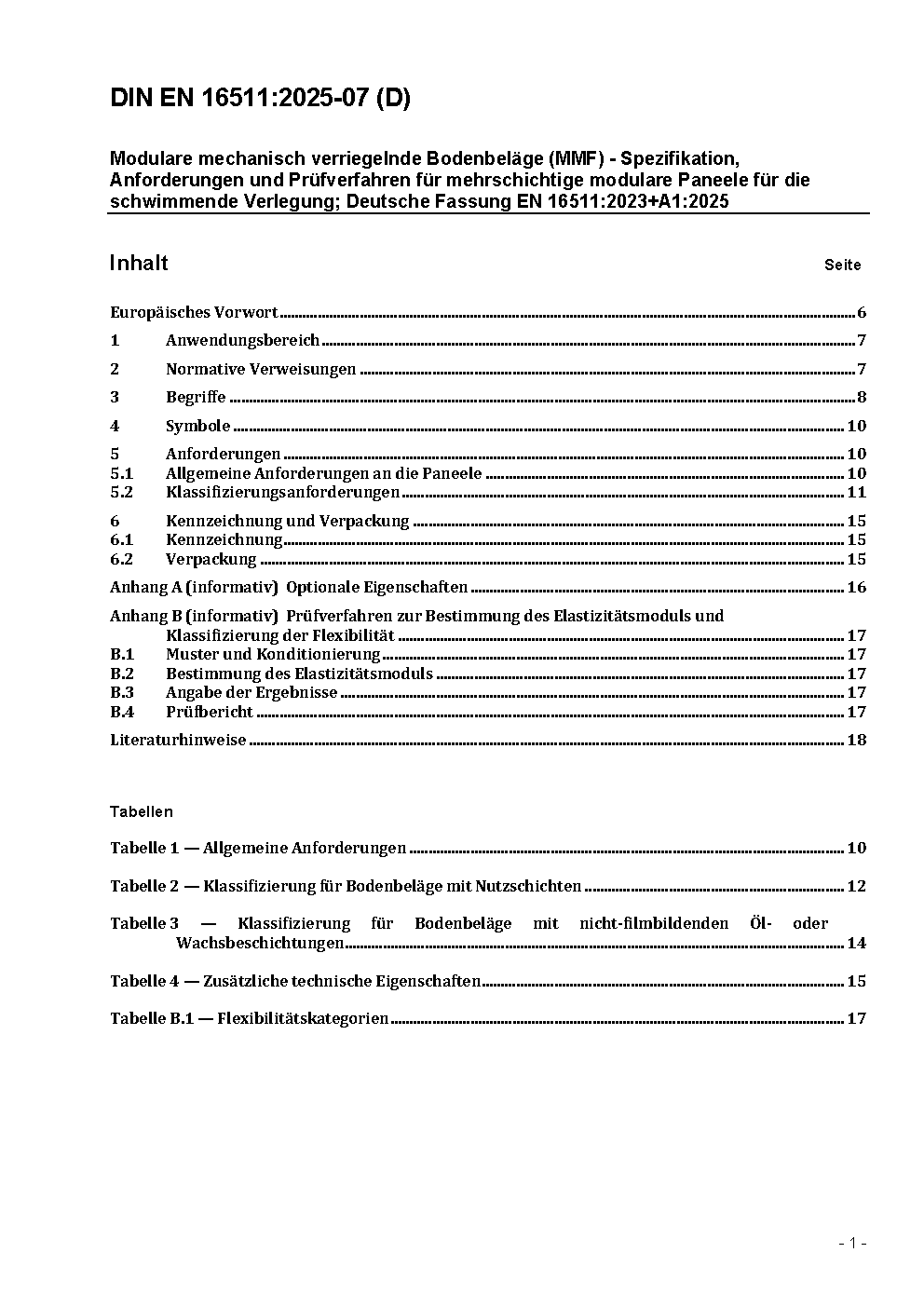 Modulare mechanisch verriegelnde Bodenbeläge (MMF) - Spezifikation, Anforderungen und Prüfverfahren für mehrschichtige modulare Paneele für die schwimmende Verlegung; Deutsche und Englische Fassung EN 16511:2023/prA1:2024