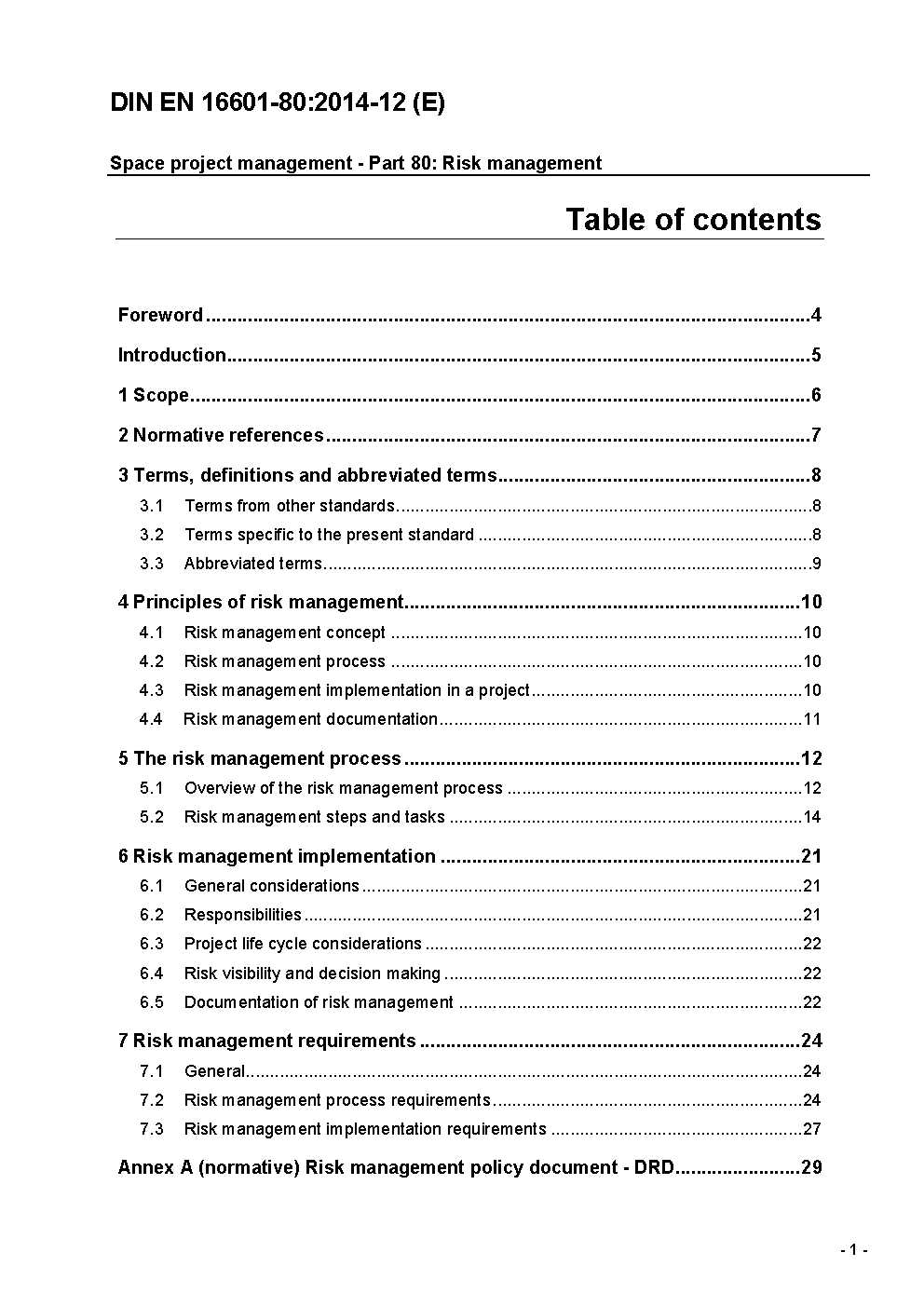 This Standard defines the principles and requirements for integrated risk management on a space project; it explains what is needed to implement a project?integrated risk management policy by any project actor, at any level (i.e. customer, first level supplier, or lower level suppliers).This Standard contains a summary of the general risk management process, which is subdivided into four (4) basic steps and nine (9) tasks. The risk management process requires information exchange among all project domains, and provides visibility over risks, with a ranking according to their criticality for the project; these risks are monitored and controlled according to the rules defined for the domains to which they belong.The fields of application of this Standard are all the activities of all the space project phases. A definition of project phasing is given in ECSS-M-ST-10.This standard may be tailored for the specific characteristics and constraints of a space project in conformance with ECSS-S-ST-00.